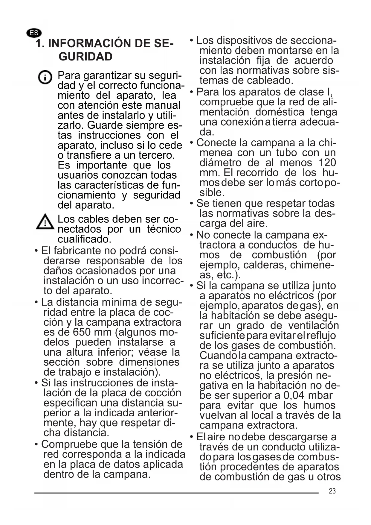 - Si la campana se utiliza junto a aparatos no eléctricos (por ejemplo, aparatos de gas), en la habitación se debe asegu- rar un grado de ventilación suficiente para evitar el reflujo de los gases de combustión. Cuando la campana extracto- ra se utiliza junto a aparatos no eléctricos, la presión ne- gativa en la habitación no de- be ser superior a 0,04 mbar para evitar que los humos vuelvan al local a través de la campana extractora.