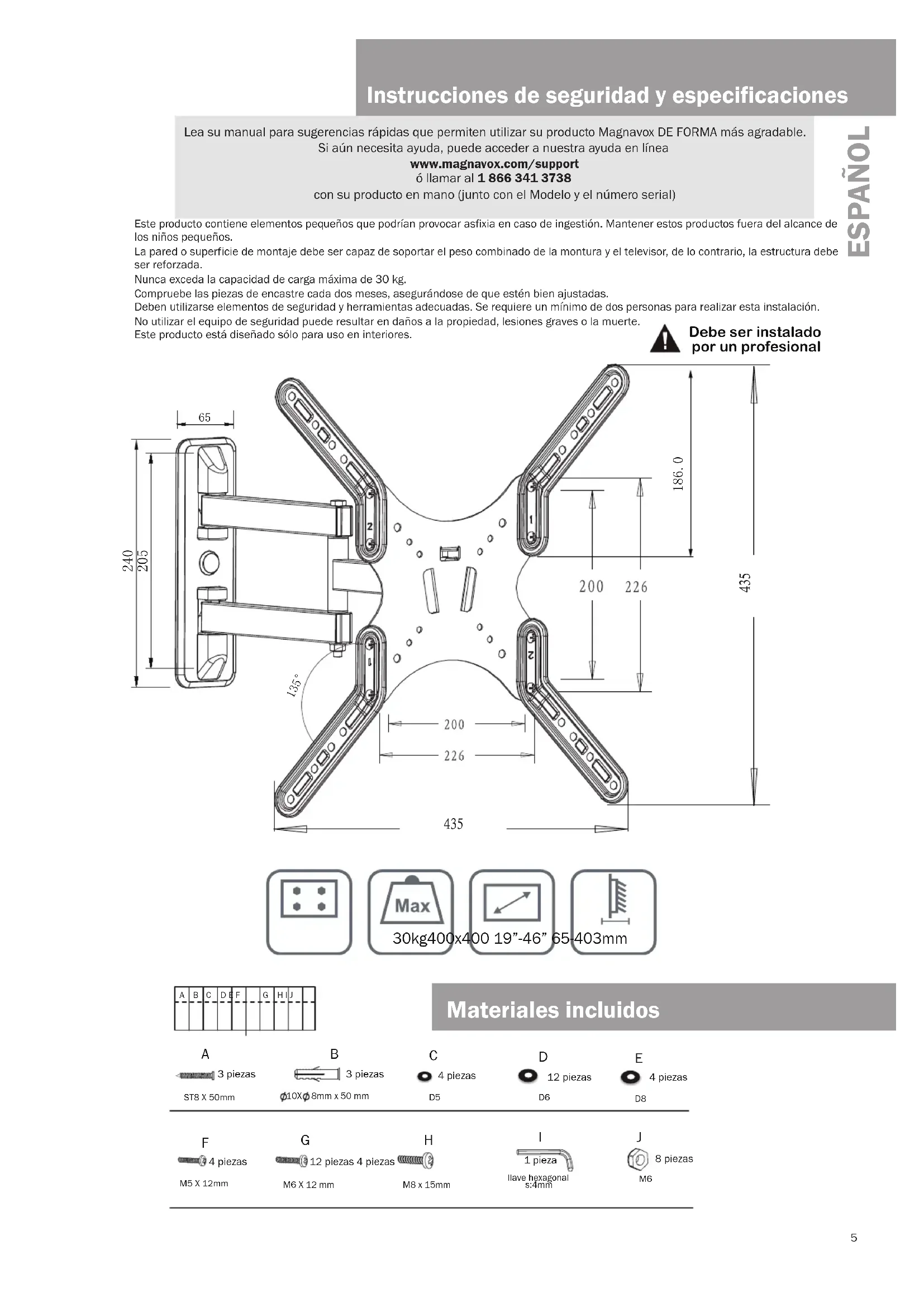 Instrucciones de seguridad y especificaciones Lea su manual para sugerencias rápidas que permiten utilizar su producto Magnavox DE FORMA más agradable. Si aún necesita ayuda, puede acceder a nuestra ayuda en línea www.magnavox.com/support ó llamar al 1 866 341 3738 con su producto en mano (junto con el Modelo y el número serial) Este producto contiene elementos pequeños que podrían provocar asfixia en caso de ingestión. Mantener estos productos fuera del alcance de los niños pequeños. La pared o superficie de montaje debe ser capaz de soportar el peso combinado de la montura y el televisor, de lo contrario, la estructura debe ser reforzada.Nunca exceda la capacidad de carga máxima de 30 kg.Compruebe las piezas de encastre cada dos meses, asegurándose de que estén bien ajustadas. Deben utilizarse elementos de seguridad y herramientas adecuadas. Se requiere un mínimo de dos personas para realizar esta instalación. No utilizar el equipo de seguridad puede resultar en daños a la propiedad, lesiones graves o la muerte.Este producto está diseñado sólo para uso en interiores. Debe ser instalado por un profesional ESPAÑOL Materiales incluidos6