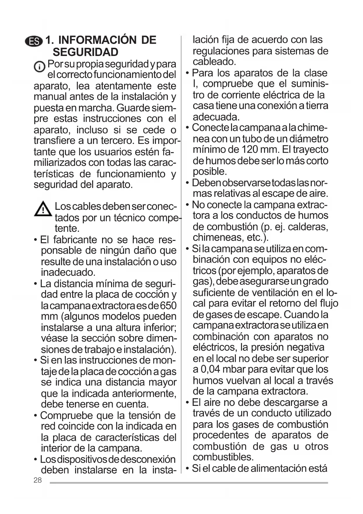 SEGURIDAD Por su propia seguridad y para el correcto funcionamiento del aparato, lea atentamente este manual antes de la instalación y puesta en marcha. Guarde siem- pre estas instrucciones con el aparato, incluso si se cede o transere a un tercero. Es impor- tante que los usuarios estén fa- miliarizados con todas las carac- terísticas de funcionamiento y seguridad del aparato. Los cables deben ser conec- tados por un técnico compe- tente.