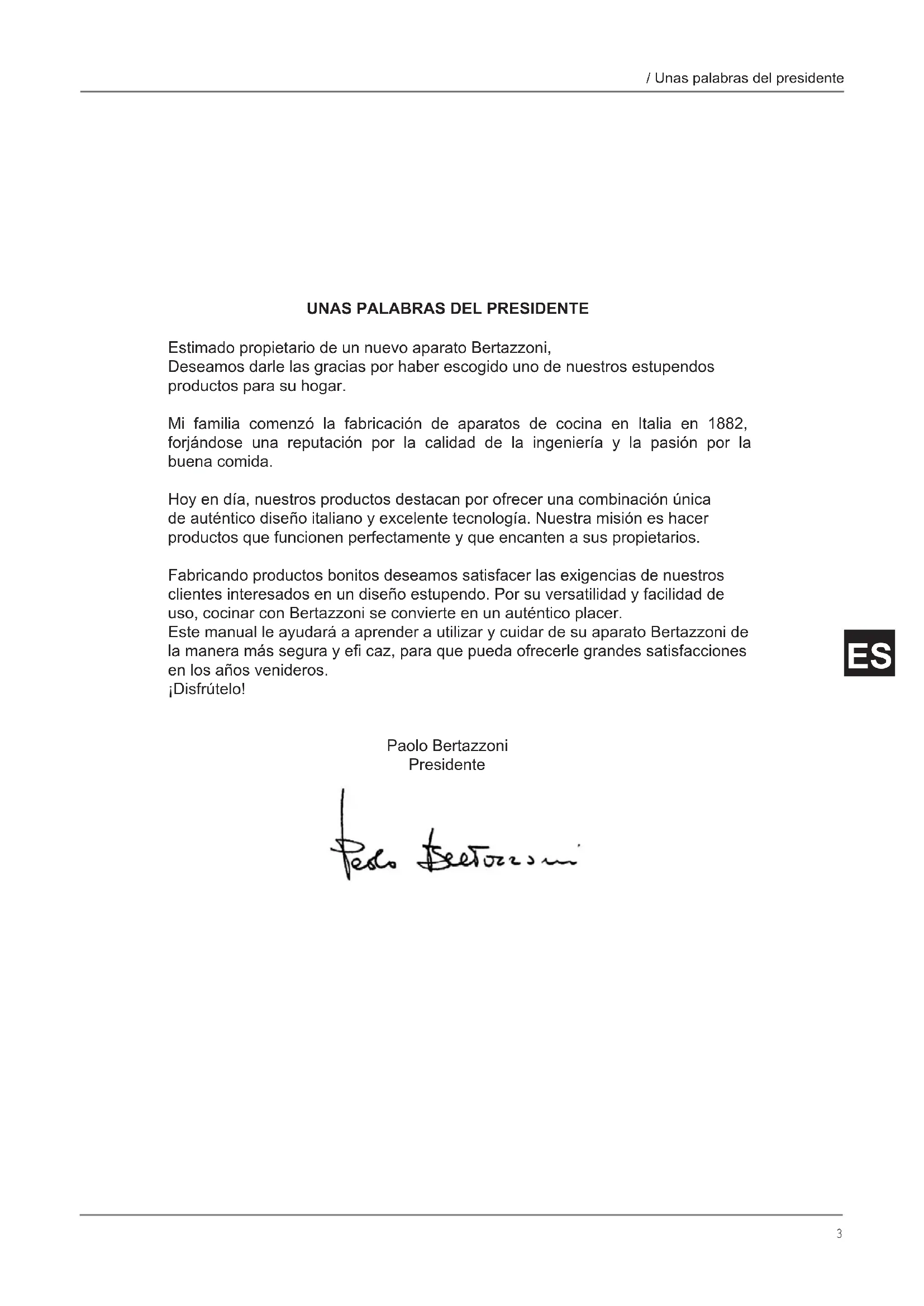 Estimado propietario de un nuevo aparato Bertazzoni, Deseamos darle las gracias por haber escogido uno de nuestros estupendos productos para su hogar. Mi familia comenzó la fabricación de aparatos de cocina en Italia en 1882, forjándose una reputación por la calidad de la ingeniería y la pasión por la buena comida. Hoy en día, nuestros productos destacan por ofrecer una combinación única de auténtico diseño italiano y excelente tecnología. Nuestra misión es hacer productos que funcionen perfectamente y que encanten a sus propietarios. Fabricando productos bonitos deseamos satisfacer las exigencias de nuestros clientes interesados en un diseño estupendo. Por su versatilidad y facilidad de uso, cocinar con Bertazzoni se convierte en un auténtico placer. Este manual le ayudará a aprender a utilizar y cuidar de su aparato Bertazzoni de la manera más segura y efi caz, para que pueda ofrecerle grandes satisfacciones en los años venideros. ¡Disfrútelo! Paolo Bertazzoni Presidente4
