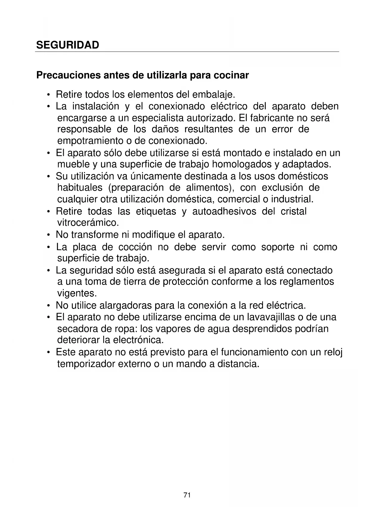 - ADVERTENCIA: matrimonial: no colocar ni guardar物件 sobre la placac de coccion.