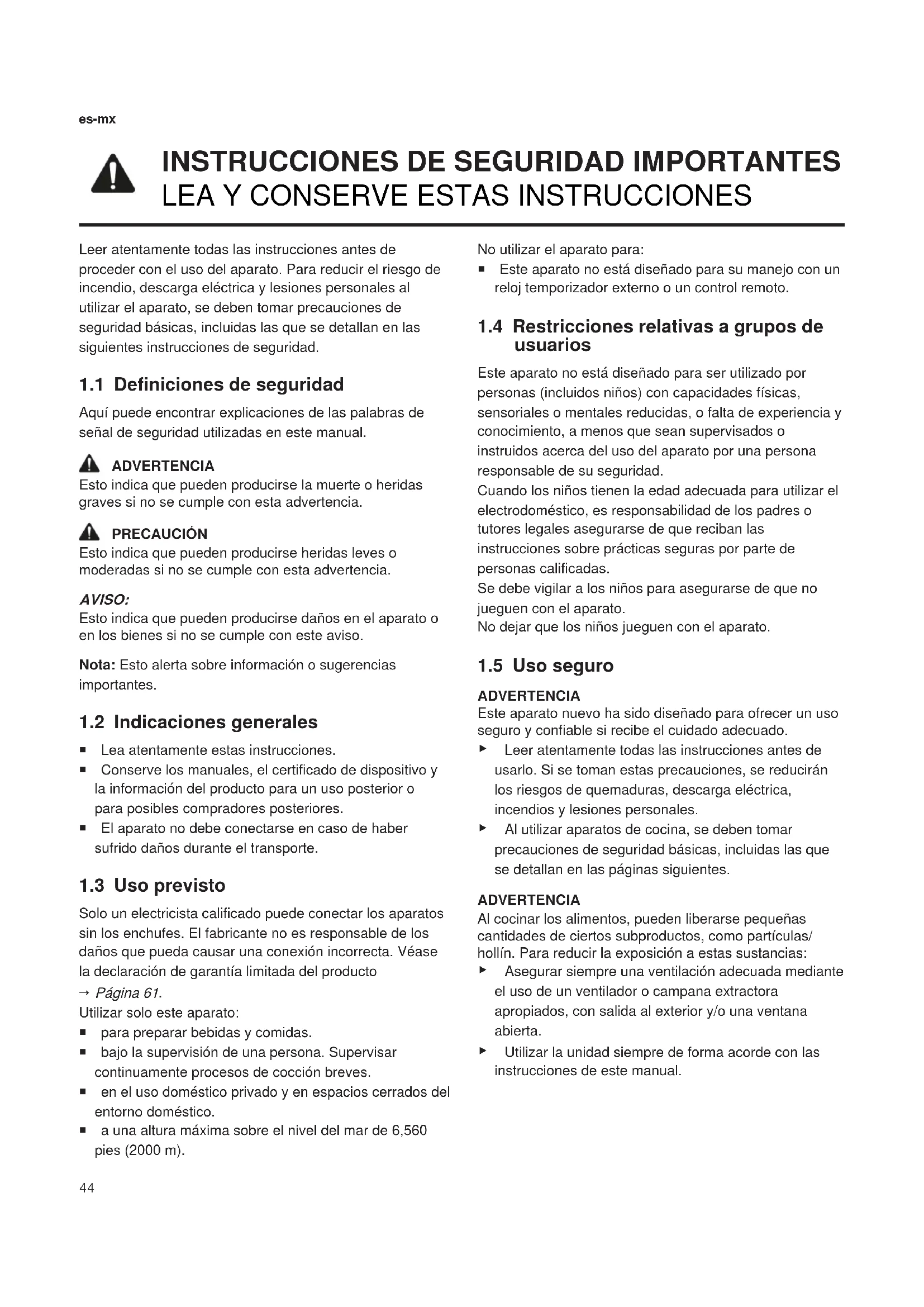 Utilizar solo este aparato: ¡ para preparar bebidas y comidas. ¡ bajo la supervisión de una persona. Supervisar continuamente procesos de cocción breves. ¡ en el uso doméstico privado y en espacios cerrados del entorno doméstico. ¡ a una altura máxima sobre el nivel del mar de 6,560 pies (2000m). No utilizar el aparato para: ¡ Este aparato no está diseñado para su manejo con un reloj temporizador externo o un control remoto. 1.4 Restricciones relativas a grupos de usuarios Este aparato no está diseñado para ser utilizado por personas (incluidos niños) con capacidades físicas, sensoriales o mentales reducidas, o falta de experiencia y conocimiento, a menos que sean supervisados o instruidos acerca del uso del aparato por una persona responsable de su seguridad. Cuando los niños tienen la edad adecuada para utilizar el electrodoméstico, es responsabilidad de los padres o tutores legales asegurarse de que reciban las instrucciones sobre prácticas seguras por parte de personas calificadas. Se debe vigilar a los niños para asegurarse de que no jueguen con el aparato. No dejar que los niños jueguen con el aparato. 1.5 Uso seguro ADVERTENCIA Este aparato nuevo ha sido diseñado para ofrecer un uso seguro y confiable si recibe el cuidado adecuado. ▶ Leer atentamente todas las instrucciones antes de usarlo. Si se toman estas precauciones, se reducirán los riesgos de quemaduras, descarga eléctrica, incendios y lesiones personales. ▶ Al utilizar aparatos de cocina, se deben tomar precauciones de seguridad básicas, incluidas las que se detallan en las páginas siguientes. ADVERTENCIA Al cocinar los alimentos, pueden liberarse pequeñas cantidades de ciertos subproductos, como partículas/ hollín. Para reducir la exposición a estas sustancias: ▶ Asegurar siempre una ventilación adecuada mediante el uso de un ventilador o campana extractora apropiados, con salida al exterior y/o una ventana abierta. ▶ Utilizar la unidad siempre de forma acorde con las instrucciones de este manual.