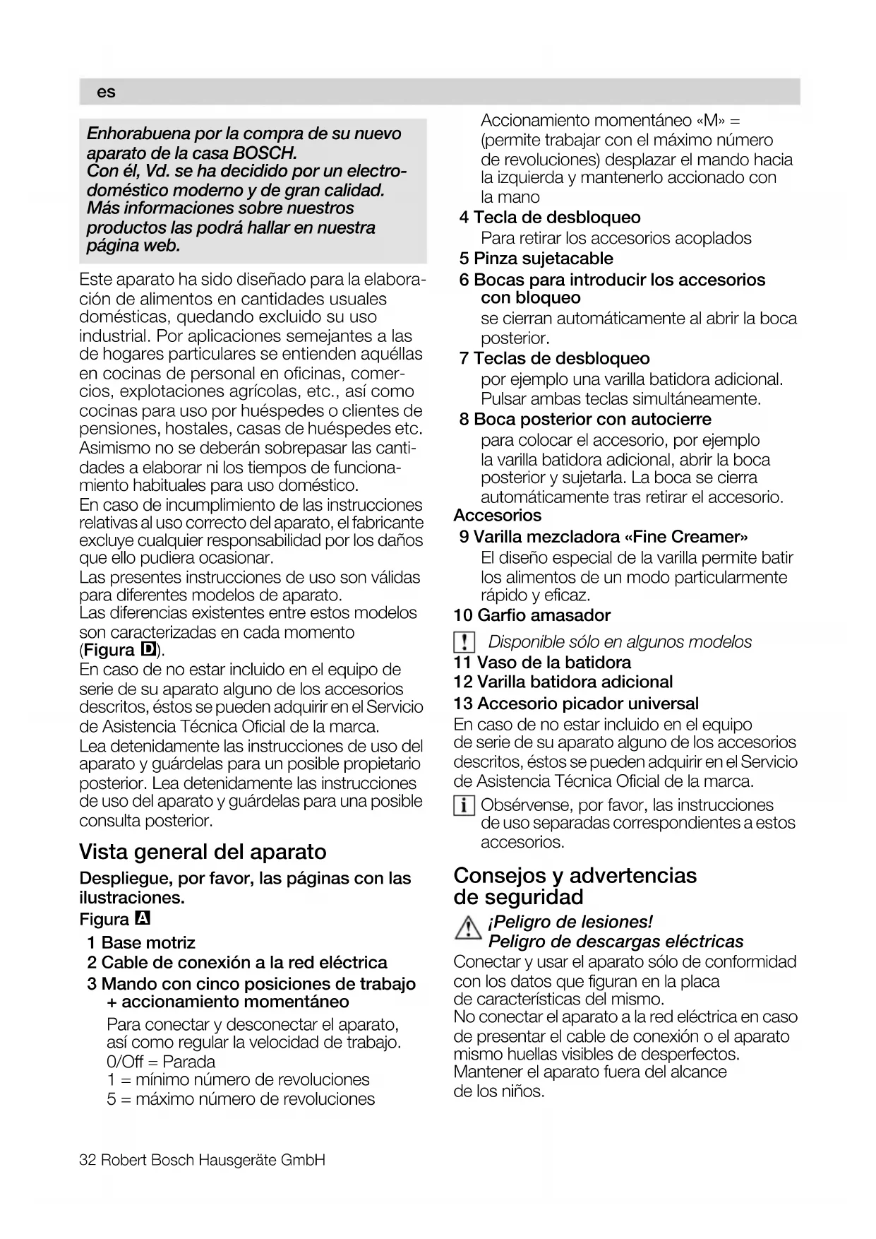 1 Base motriz 2 Cable de conexión a la red eléctrica 3 Mando con cinco posiciones de trabajo + accionamiento momentáneo Para conectar y desconectar el aparato, así como regular la velocidad de trabajo. 0/Off = Parada 1 = mínimo número de revoluciones 5 = máximo número de revoluciones Accionamiento momentáneo «M» = (permite trabajar con el máximo número de revoluciones) desplazar el mando hacia la izquierda y mantenerlo accionado con la mano 4 Tecla de desbloqueo Para retirar los accesorios acoplados 5 Pinza sujetacable 6 Bocas para introducir los accesorios con bloqueo se cierran automáticamente al abrir la boca posterior. 7 Teclas de desbloqueo por ejemplo una varilla batidora adicional. Pulsar ambas teclas simultáneamente. 8 Boca posterior con autocierre para colocar el accesorio, por ejemplo la varilla batidora adicional, abrir la boca posterior y sujetarla. La boca se cierra automáticamente tras retirar el accesorio. Accesorios 9 Varilla mezcladora «Fine Creamer» El diseño especial de la varilla permite batir los alimentos de un modo particularmente rápido y eficaz. 10 Garfio amasador aáëéçåáÄäÉ=ëμäç=Éå=~äÖìåçë=ãçÇÉäçë 11 Vaso de la batidora 12 Varilla batidora adicional 13 Accesorio picador universal En caso de no estar incluido en el equipo de serie de su aparato alguno de los accesorios descritos, éstos se pueden adquirir en el Servicio de Asistencia Técnica Oficial de la marca. Obsérvense, por favor, las instrucciones de uso separadas correspondientes a estos accesorios. Consejos y advertencias de seguridad flmÉäáÖêç=ÇÉ=äÉëáçåÉë> mÉäáÖêç=ÇÉ=ÇÉëÅ~êÖ~ë=Éä¨ÅíêáÅ~ë Conectar y usar el aparato sólo de conformidad con los datos que figuran en la placa de características del mismo. No conectar el aparato a la red eléctrica en caso de presentar el cable de conexión o el aparato mismo huellas visibles de desperfectos. Mantener el aparato fuera del alcance de los niños.