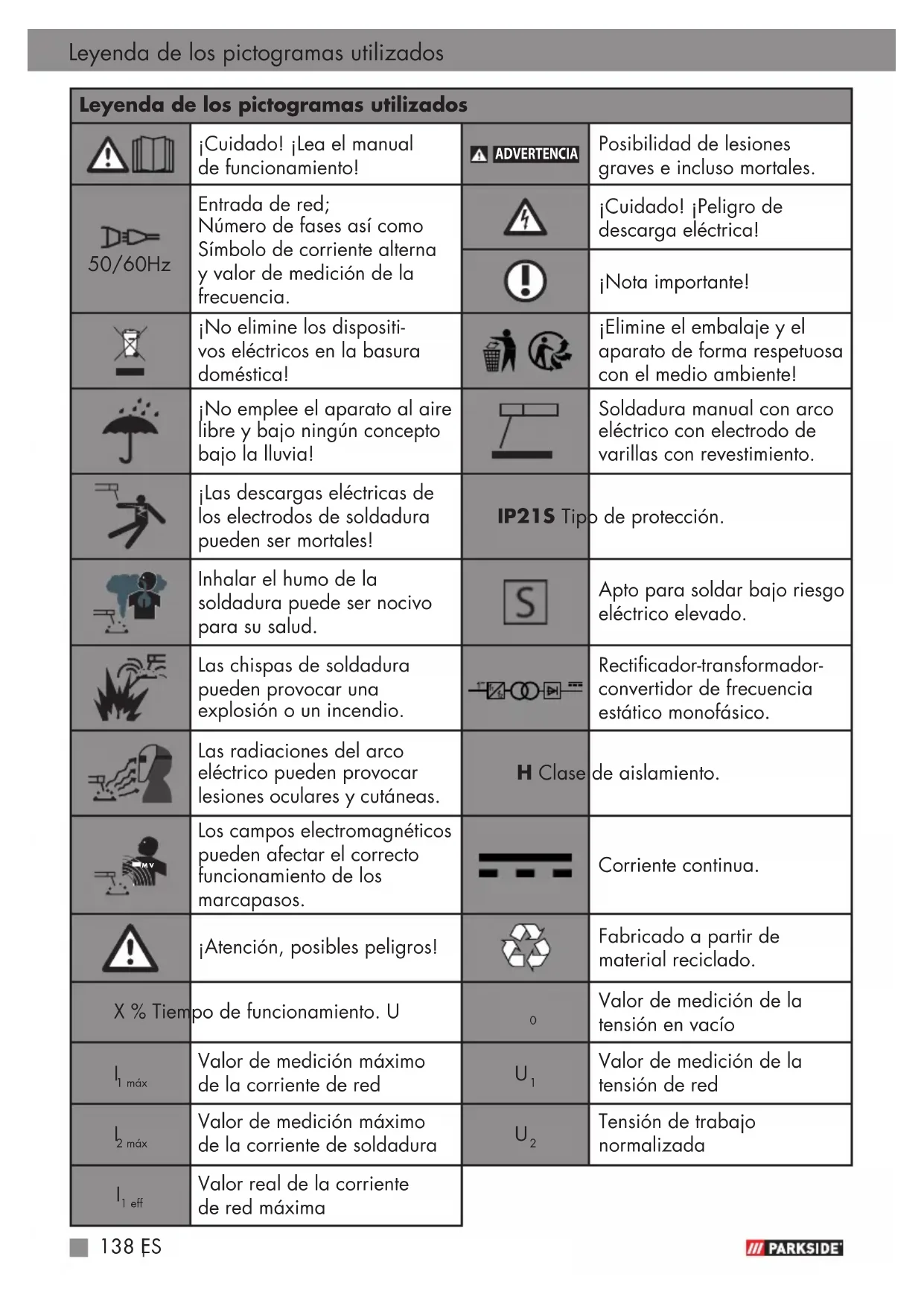 ADVERTENCIA Evite el contacto directo con el circuito eléctrico de soldadura. La tensión en vacío entre la pinza portaelec- trodos y la pinza de puesta a tierra puede ser peligrosa, ya que existe peligro de descarga eléctrica. No guarde ni use el aparato en lugares húmedos o moja- dos ni bajo la lluvia. En este sentido aplica la disposición de protección IP21S. Protéjase los ojos con cristales protectores adecuados para ello (DIN grado 9-10) que deberá fijar a la pantalla de soldadura suministrada. Use guantes y ropa de protección seca libre de aceite y grasa para proteger la piel de la radiación ultravioleta del arco eléctrico.