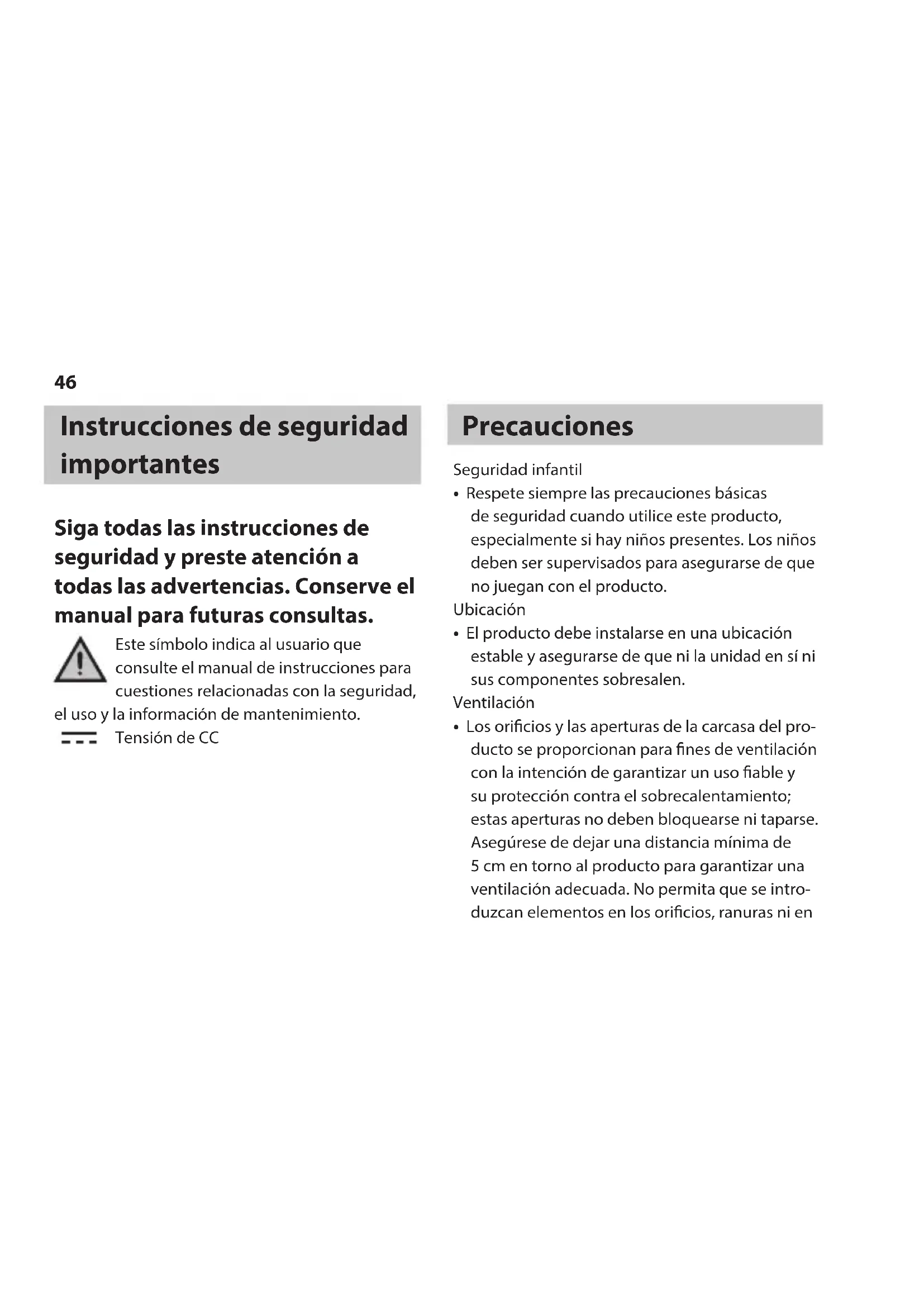 Este símbolo indica al usuario que consulte el manual de instrucciones para cuestiones relacionadas con la seguridad, el uso y la información de mantenimiento. Tensión de CC Precauciones Seguridad infantil