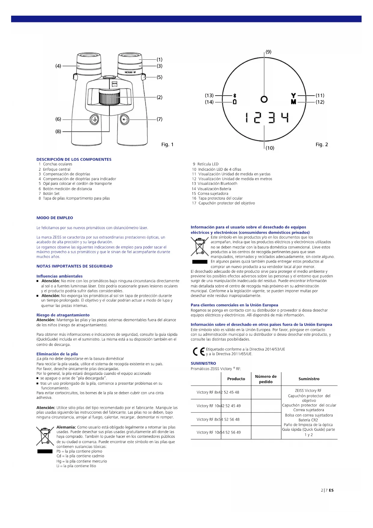 RF: Producto Número de pedido Suministro Victory RF 8x42 52 45 48 ZEISS Victory RF Capuchón protector del objetivo Capuchón protector del ocular Correa sujetadora Bolsa con correa sujetadora Batería CR2 Paño de limpieza de la óptica Guía rápida (Quick Guide) parte 1 y 2 Victory RF 10x42 52 45 49 Victory RF 8x54 52 56 48 Victory RF 10x54 52 56 49 (5) (3) (1) Fig. 1 (7) (4) (6) (8) (2) Fig. 2 (12) (11) (14) (13) (9) (10) 9 Retícula LED 10 Indicación LED de 4 cifras 11 Visualización Unidad de medida en yardas 12 Visualización Unidad de medida en metros 13 Visualización Bluetooth 14 Visualización Batería 15 Correa sujetadora 16 Tapa protectora del ocular 17 Capuchón protector del objetivo