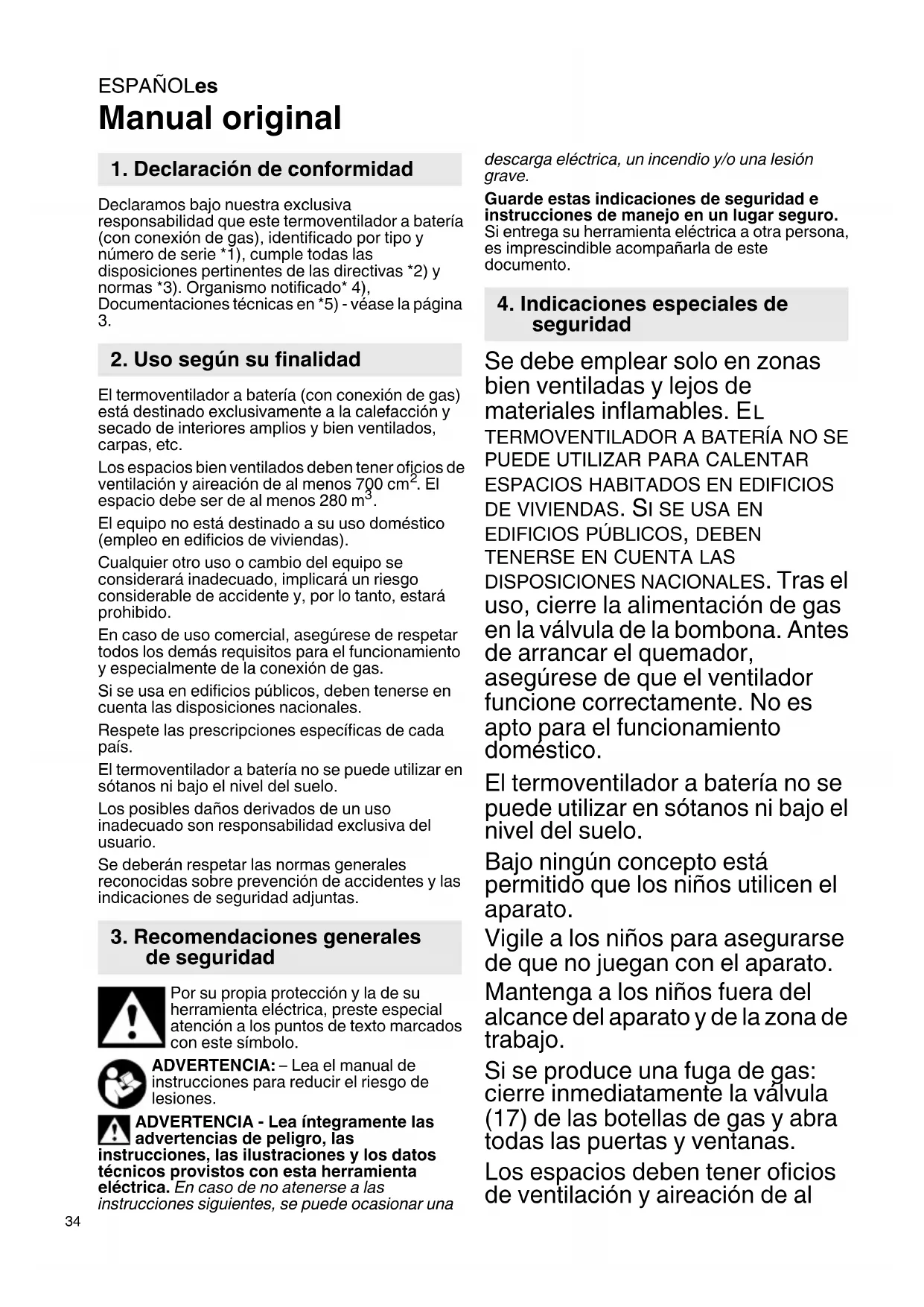 El equipo no está destinado a su uso doméstico (empleo en edificios de viviendas). Cualquier otro uso o cambio del equipo se considerará inadecuado, implicará un riesgo considerable de accidente y, por lo tanto, estará prohibido. En caso de uso comercial, asegúrese de respetar todos los demás requisitos para el funcionamiento y especialmente de la conexión de gas. Si se usa en edificios públicos, deben tenerse en cuenta las disposiciones nacionales. Respete las prescripciones específicas de cada país. El termoventilador a batería no se puede utilizar en sótanos ni bajo el nivel del suelo. Los posibles daños derivados de un uso inadecuado son responsabilidad exclusiva del usuario. Se deberán respetar las normas generales reconocidas sobre prevención de accidentes y las indicaciones de seguridad adjuntas. Por su propia protección y la de su herramienta eléctrica, preste especial atención a los puntos de texto marcados con este símbolo. ADVERTENCIA: – Lea el manual de instrucciones para reducir el riesgo de lesiones. ADVERTENCIA - Lea íntegramente las advertencias de peligro, las instrucciones, las ilustraciones y los datos técnicos provistos con esta herramienta eléctrica. En caso de no atenerse a las instrucciones siguientes, se puede ocasionar una descarga eléctrica, un incendio y/o una lesión grave. Guarde estas indicaciones de seguridad e instrucciones de manejo en un lugar seguro. Si entrega su herramienta eléctrica a otra persona, es imprescindible acompañarla de este documento. Se debe emplear solo en zonas bien ventiladas y lejos de materiales inflamables. E