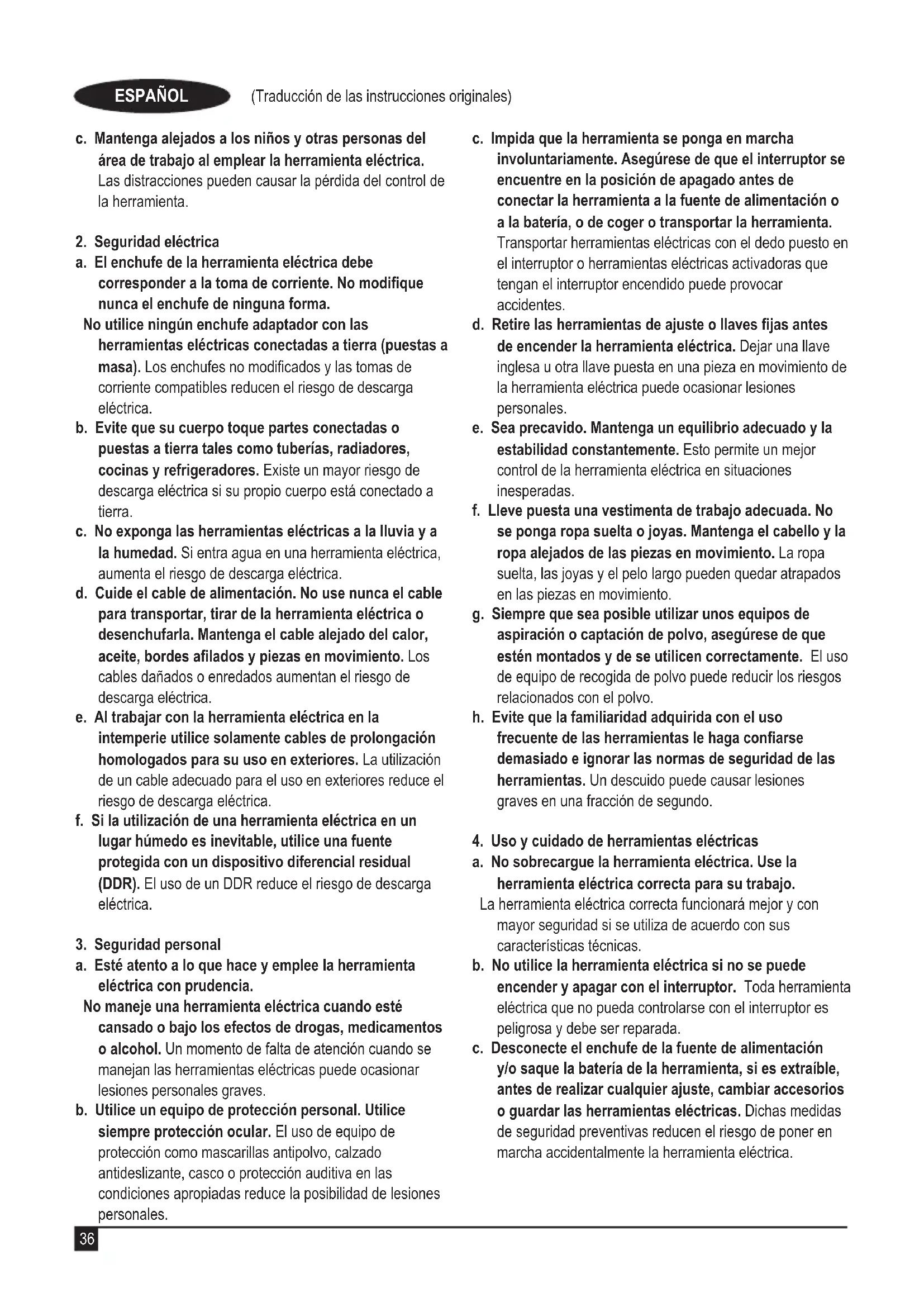 ¡Advertencia! Lea todas las advertencias de seguridad, instrucciones, ilustraciones especicaciones suministradas con esta herramienta eléctrica. En caso de no atenerse a las siguientes advertencias e instrucciones de seguridad, podría producirse una descarga eléctrica, incendio o lesión grave.Guarde todas las advertencias e instrucciones para futuras consultas. El término “herramienta eléctrica” empleado en las advertencias a continuación hace referencia a la herramienta eléctrica con alimentación de red (con cable) o alimentada por batería (sin cable).1. Seguridad del área de trabajoa. Mantenga limpia y bien iluminada el área de trabajo. Las áreas en desorden u oscuras pueden provocar accidentes.b. No utilice herramientas eléctricas en entornos con peligro de explosión, como aquellos en los que haya líquidos, gases o polvos inamables. Las herramientas eléctricas originan chispas que pueden inamar el polvo o los gases.36 (Traducción de las instrucciones originales) ESPAÑOL c. Mantenga alejados a los niños y otras personas del área de trabajo al emplear la herramienta eléctrica. Las distracciones pueden causar la pérdida del control de la herramienta.
