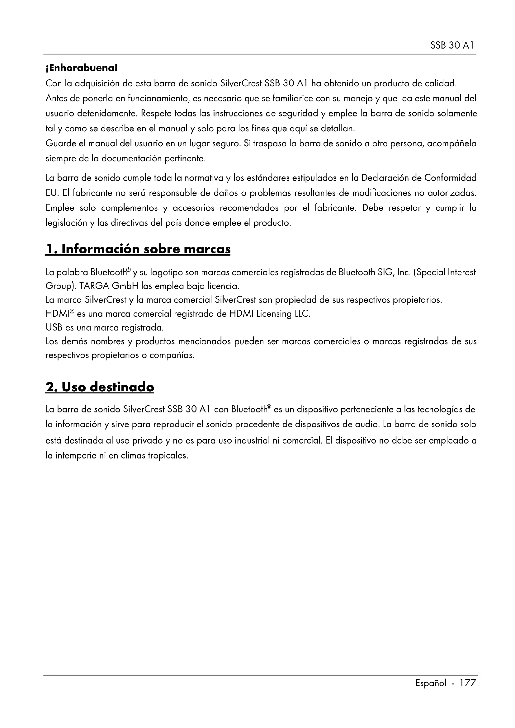 Español - 177 ¡Enhorabuena! Con la adquisición de esta barra de sonido SilverCrest SSB 30 A1 ha obtenido un producto de calidad. Antes de ponerla en funcionamiento, es necesario que se familiarice con su manejo y que lea este manual del usuario detenidamente. Respete todas las instrucciones de seguridad y emplee la barra de sonido solamente tal y como se describe en el manual y solo para los fines que aquí se detallan. Guarde el manual del usuario en un lugar seguro. Si traspasa la barra de sonido a otra persona, acompáñela siempre de la documentación pertinente. La barra de sonido cumple toda la normativa y los estándares estipulados en la Declaración de Conformidad EU. El fabricante no será responsable de daños o problemas resultantes de modificaciones no autorizadas. Emplee solo complementos y accesorios recomendados por el fabricante. Debe respetar y cumplir la legislación y las directivas del país donde emplee el producto.
