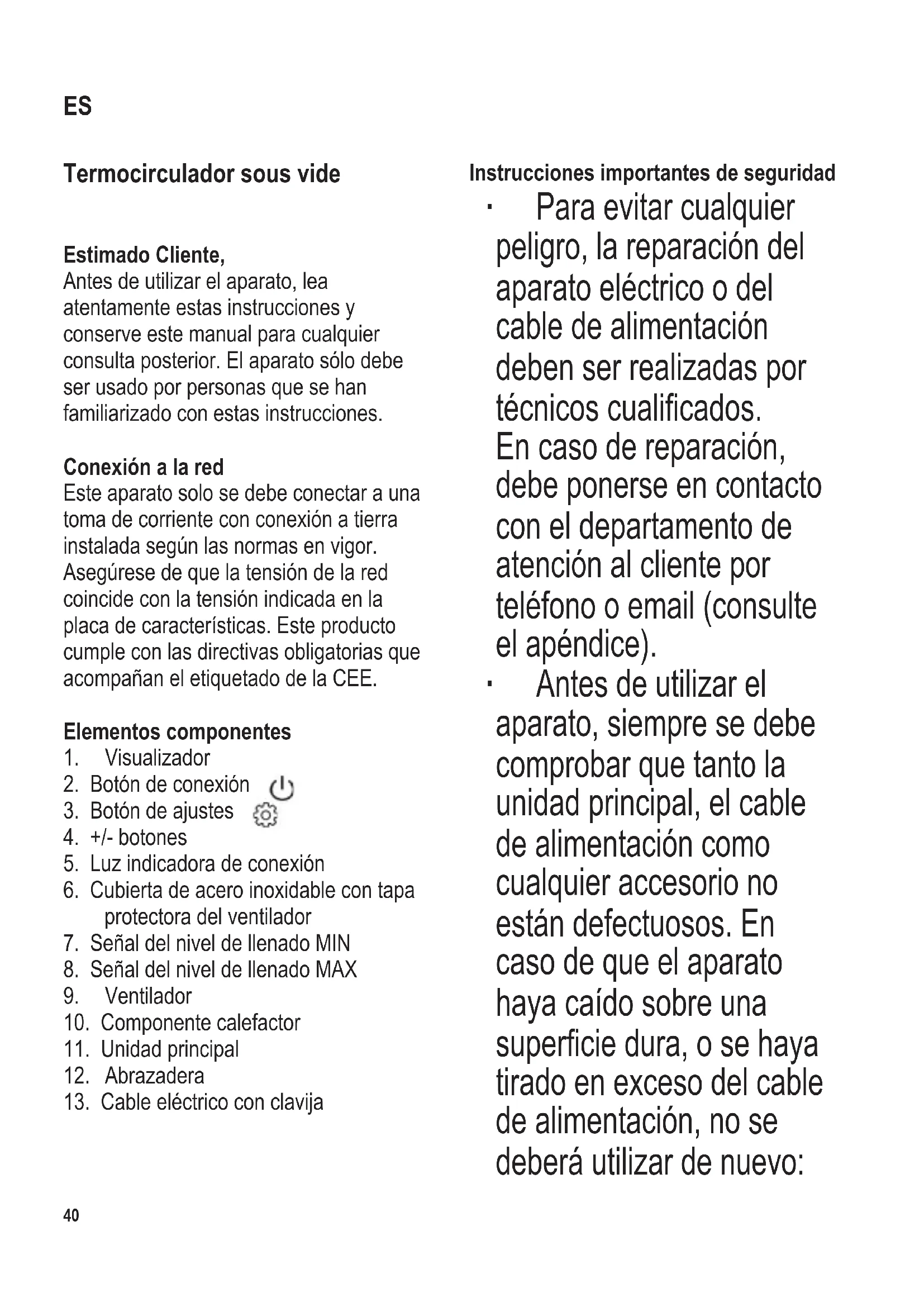 Instrucciones importantes de seguridad ∙ Para evitar cualquier peligro, la reparación del aparato eléctrico o del cable de alimentación deben ser realizadas por técnicos cualicados. En caso de reparación, debe ponerse en contacto con el departamento de atención al cliente por teléfono o email (consulte el apéndice). ∙ Antes de utilizar el aparato, siempre se debe comprobar que tanto la unidad principal, el cable de alimentación como cualquier accesorio no están defectuosos. En caso de que el aparato haya caído sobre una supercie dura, o se haya tirado en exceso del cable de alimentación, no se deberá utilizar de nuevo: ES104 x 142 mm