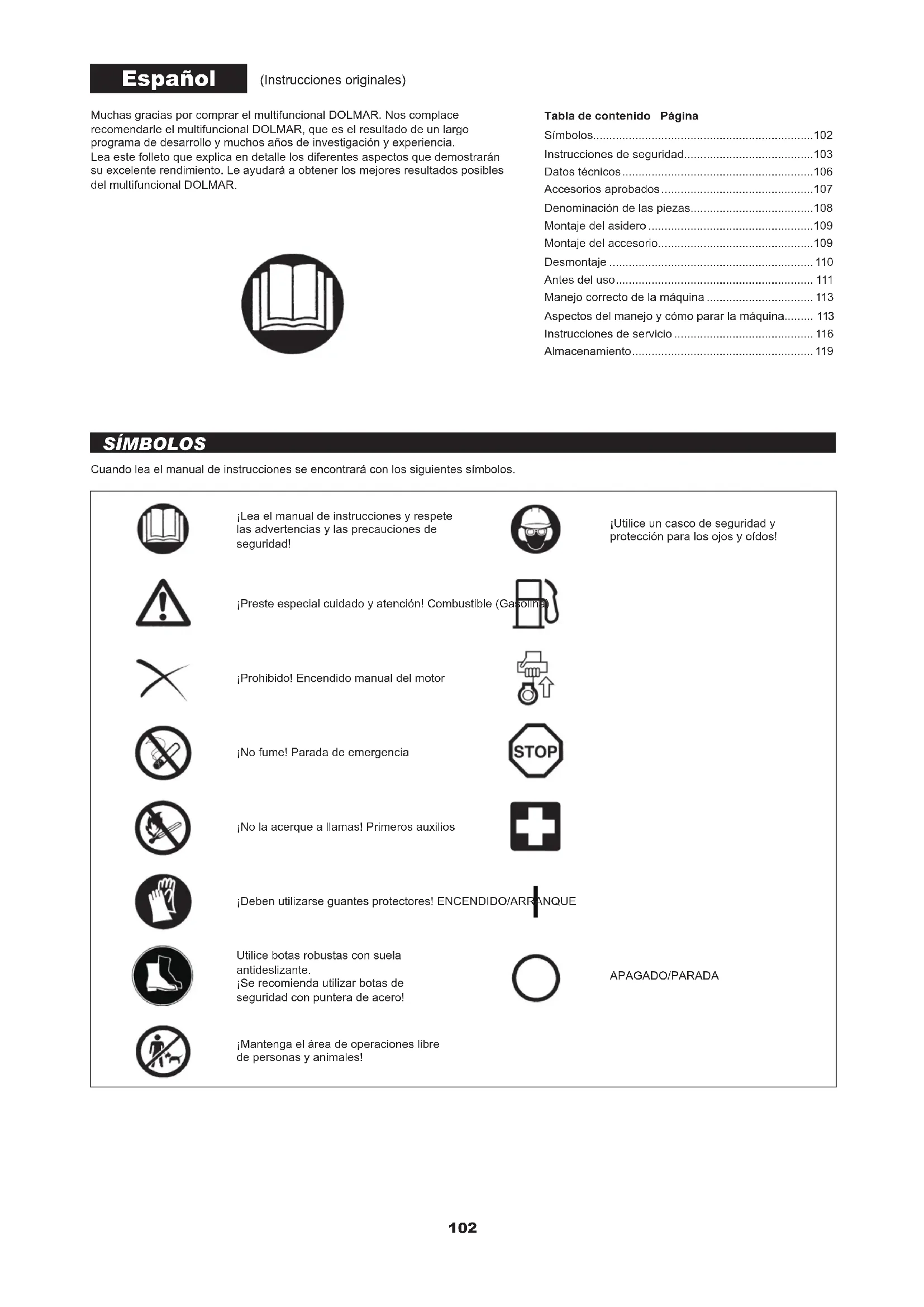 - Sustitución de la herramienta 3 metros105 Método de trabajo - Utilice el multifuncional únicamente con buena luz y visibilidad. Durante el invierno tenga cuidado con las áreas húmedas o resbaladizas, hielo y nieve (riesgo de resbalar). Asegúrese siempre de que sus pies se encuentran en una posición segura. - No se suba nunca a una escalera mientras utilice el multifuncional. - No se suba a árboles mientras realice la operación de corte con el multifuncional. - No trabaje nunca en supercies inestables. - Antes de utilizar el accesorio, debe haber alcanzado la velocidad de trabajo completa. - Descanse para evitar la pérdida de control causada por la fatiga. Recomendamos descansar de 10 a 20 minutos cada hora. Instrucciones de mantenimiento - Haga que su equipo sea sometido a tareas de mantenimiento en nuestro centro de servicio autorizado, utilizando siempre y de forma exclusiva recambios originales. Una reparación incorrecta y un mantenimiento deciente pueden acortar la vida útil del equipo y aumentar el riesgo de accidentes. - Utilice el multifuncional de forma que provoque el menor ruido y contaminación posibles. En concreto, compruebe el ajuste correcto del carburador. - Limpie el multifuncional periódicamente y compruebe que todos los tornillos y tuercas estén bien apretados. - Nunca realice trabajos de mantenimiento o almacene el multifuncional en la proximidad de llamas. - Guarde siempre el multifuncional en habitaciones cerradas con llave y con el depósito de combustible vacío. Si se tiene que vaciar el depósito de combustible, esta operación se debe realizar al aire libre. Respete las instrucciones aplicables de prevención de accidentes emitidas por las compañías de seguros y las asociaciones comerciales relevantes. No realice ninguna modicación en el multifuncional, ya que esto pondría en peligro su seguridad. Los trabajos de mantenimiento o reparación que puede realizar el usuario se limitan a las actividades descritas en este manual de instrucciones. Todos los demás trabajos los realiza un agente de servicio autorizado. Utilice únicamente accesorios y piezas de repuesto genuinos suministrados por DOLMAR. El uso de accesorios y herramientas que no se hayan aprobado implica un mayor riesgo de accidentes. DOLMAR no acepta ninguna responsabilidad por los accidentes o los daños causados por el uso de accesorios no aprobados, por la reparación de los elementos de acoplamiento o accesorios. Vibración - Las personas con problemas circulatorios que están expuestas a vibraciones excesivas pueden sufrir lesiones en los vasos sanguíneos o en el sistema nervioso. La vibración puede provocar los siguientes síntomas en los dedos, manos o muñecas: “adormecimiento”, hormigueo, dolor, sensación punzante, alteración del color de la piel o de la piel. Si sufre alguno de estos síntomas, acuda a un médico. - Para reducir el riesgo de “enfermedad de dedos blancos”, mantenga las manos calientes durante el uso y realice un buen mantenimiento del equipo y los accesorios. Primeros auxilios En caso de accidente, asegúrese de que cerca del lugar en el que se realicen las operaciones de corte esté disponible un botiquín de primeros auxilios. Reponga inmediatamente cualquier artículo que tome del botiquín de primeros auxilios. Cuando solicite ayuda, proporcione la siguiente información: - Lugar del accidente - Qué ha ocurrido - Número de personas heridas - Tipo de lesiones - Su nombre DECLARACIÓN DE CONFORMIDAD DE LA CE Sólo para países europeos La Declaración de conformidad de la CE se incluye como Anexo A en este manual de instrucciones.106
