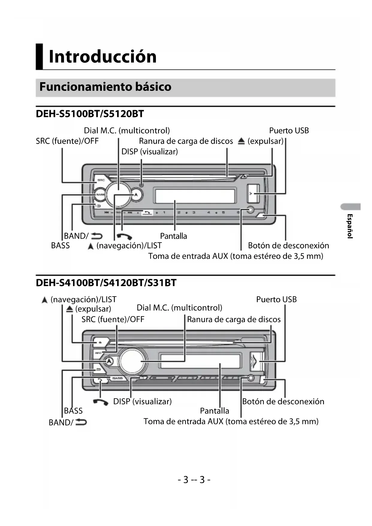 - 70 W × 1 canal/2 Ω (para subwoofer) (DEH-S31BT) Salida de potencia continua: 22 W × 4 (de 50 Hz a 15 000 Hz, 5 % THD, 4 Ω de carga, ambos canales activados) Impedancia de carga: 4 Ω (posible entre 4 y 8Ω (2 Ω para 1 canal)) Nivel de salida máxima preamplificada: 2,0 V (DEH-S5100BT/S4100BT/S31BT), 4,0 V (DEH-S5120BT/S4120BT) Ecualizador (ecualizador gráfico de 13 bandas): Especificaciones- 45 - Español Frecuencia: 50 Hz/80 Hz/125 Hz/200 Hz/315 Hz/500 Hz/800 Hz/1,25 kHz/2 kHz/3,15 kHz/5 kHz/8 kHz/12,5 kHz Ganancia: ±12 dB (incrementos de 2dB) Filtro de paso alto: Frecuencia: 25 Hz/31,5 Hz/40 Hz/50 Hz/63 Hz/80 Hz/100 Hz/125 Hz/160 Hz/200 Hz/250 Hz Pendiente: –6 dB/oct, –12 dB/oct, –18 dB/oct, –24 dB/oct, OFF Subwoofer/salida de paso alto: Frecuencia: 25 Hz/31,5 Hz/40 Hz/50 Hz/63 Hz/80 Hz/100 Hz/125 Hz/160 Hz/200 Hz/250 Hz Pendiente: –6 dB/oct, –12 dB/oct, –18 dB/oct, –24 dB/oct, –30 dB/oct, –36 dB/oct, OFF Fase: normal/inversa Nivel del altavoz: de +10 dB a –24 dB (incrementos de 1 dB) Alineación de tiempo: de 0 a 140 pulgadas (1 pulgada/ incremento) Reproductor de CD Sistema: sistema de audio de disco compacto Discos utilizables: discos compactos Relación señal/ruido: 94 dB (1 kHz) (red IEC-A) Cantidad de canales: 2 (estéreo) Formato de decodificación de MP3: MPEG- 1 y 2 Audio Layer 3 WMA formato de decodificación: Ver. 7, 8, 9, 9.1, 9.2 (audio de 2 ch) Formato de decodificación de AAC: MPEG- 4 AAC (solo codificado por iTunes) (versión 10.6 y anterior) (solo DEH- S5100BT/S4100BT/S4120BT/S5120BT) Formato de señal WAV: Linear PCM (sin comprimir) USB Especificación del estándar USB: USB 2.0 velocidad máxima Consumo máximo de corriente: 1,5 A USB Protocolo: MSC (clase de almacenamiento masivo) MTP (Media Transfer Protocol) AOA (Android Open Accessory) 2.0 Sistema de archivos: FAT12, FAT16, FAT32 Formato de decodificación de MP3: MPEG- 1 y 2 Audio Layer 3 WMA formato de decodificación: Ver. 7, 8, 9, 9.1, 9.2 (audio de 2 ch) Formato de decodificación de AAC: MPEG- 4 AAC (solo codificado por iTunes) (versión 10.6 y anterior) (solo DEH- S5100BT/S4100BT/S4120BT/S5120BT) Formato de decodificación FLAC: v1.2.1 (códec de audio sin pérdida gratuito) Formato de señal WAV: Linear PCM (sin comprimir) Sintonizador FM Rango de frecuencia: de 87,9 MHz a 107,9 MHz Sensibilidad utilizable: 11 dBf (1,0 μV/75 Ω, monoaural, señal/ruido: 30 dB) Relación señal/ruido: 65 dB (transmisión analógica) (red IHF-A) Sintonizador AM Rango de frecuencia: de 530 kHz a 1 710 kHz Sensibilidad utilizable: 25 μV (señal/ruido: 20 dB) Relación señal/ruido: 60 dB (transmisión analógica) (red IHF-A) Bluetooth Versión: certificada para Bluetooth 4.0 Potencia de salida: máximo de +4 dBm (clase de potencia 2) Versión de BLE (Bluetooth Low Energy): 4.0 certificada- 46 - Español Potencia de salida de BLE (Bluetooth Low Energy): +3 dBm como máximo Bandas de frecuencia: de 2 400 MHz a 2483,5MHz Perfiles Bluetooth: GAP (perfil de acceso genérico) SDAP (perfil de aplicación de descubrimiento de servicios) HFP (perfil de manos libres) 1.6 PBAP (perfil de acceso a libreta telefónica) A2DP (perfil de distribución de audio avanzada) AVRCP (perfil de control remoto de audio/video) 1.5 SPP (perfil de puerto serial) 1.1 Especificaciones de CEA2006 Salida de potencia: 14 W RMS × 4 canales (4 Ω y 1 % THD+N) Relación señal/ruido: 91 dBA (referencia: 1W a 4Ω) NOTA Las especificaciones y el diseño están sujetos a modificaciones sin previo aviso.
