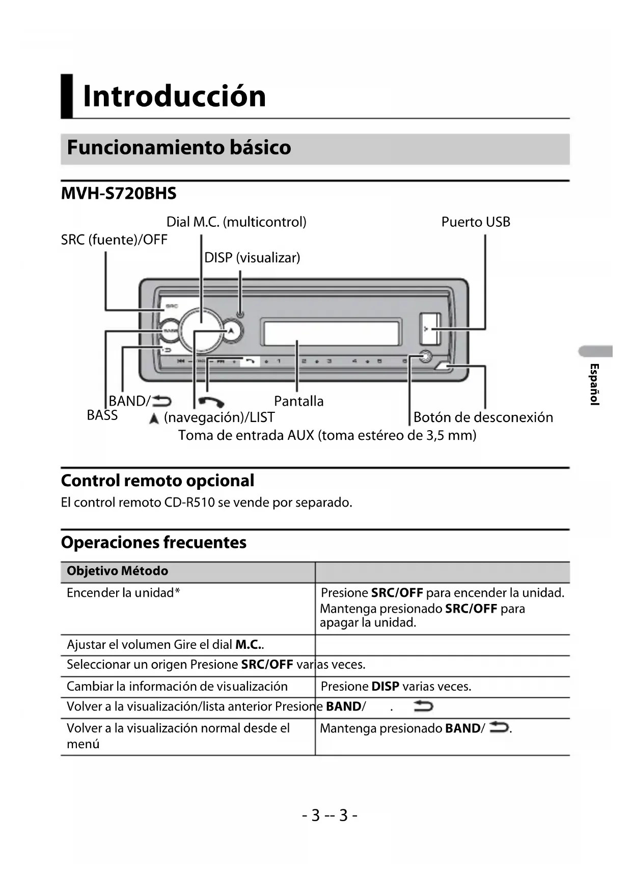 - En las instrucciones siguientes, una memoria USB o un reproductor de audio USB se denominan “dispositivo USB”. Índice- 3 -- 3 - Español MVH-S720BHS Control remoto opcional El control remoto CD-R510 se vende por separado. Operaciones frecuentes Introducción Funcionamiento básico Objetivo Método Encender la unidad* Presione SRC/OFF para encender la unidad. Mantenga presionado SRC/OFF para apagar la unidad.Ajustar el volumen Gire el dial M.C..Seleccionar un origen Presione SRC/OFF varias veces. Cambiar la información de visualización Presione DISP varias veces. Volver a la visualización/lista anterior Presione BAND/.Volver a la visualización normal desde el menú Mantenga presionado BAND/. SRC (fuente)/OFF Botón de desconexión Pantalla Dial M.C. (multicontrol) BAND/ DISP (visualizar) (navegación)/LIST Puerto USB Toma de entrada AUX (toma estéreo de 3,5 mm) BASS- 4 - Español