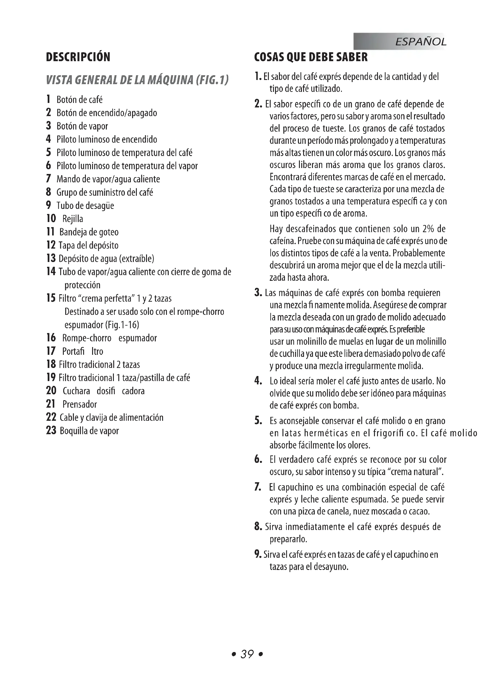 tazas para el desayuno.• 40 • ESPAÑOL INTRODUCCIÓN Antes de usar la máquina por primera vez, lea cuida- dosamente el folleto de seguridad entregado aparte y consérvelo para futuras consultas. FILTROS INCLUIDOS Filtro “crema perfetta” para 1 o 2 tazas (Fig.5). Este ltro ya está montado en el porta ltro y permite obtener un café exprés con crema incluso durante los primeros usos de la máquina. Nota. Este ltro solo debe usarse en combinación con el rompe-chorro espumador. (Fig.1-16). Filtro tradicional 2 tazas (Fig.7). Filtro tradicional 1 taza/pastilla de café monodosis (Fig.6). Estos filtros son como los utilizados en las máquinas profesionales de bar y requieren destreza y experiencia. Nota. Estos ltros no deben ser usados junto con el rompe-chorro espumador. (Fig.1-16). Nuestro consejo es comenzar con el ltro “crema perfetta” y, una vez que haya adquirido destreza y experiencia, pasar a los tradicionales para preparar café como un verdadero barman