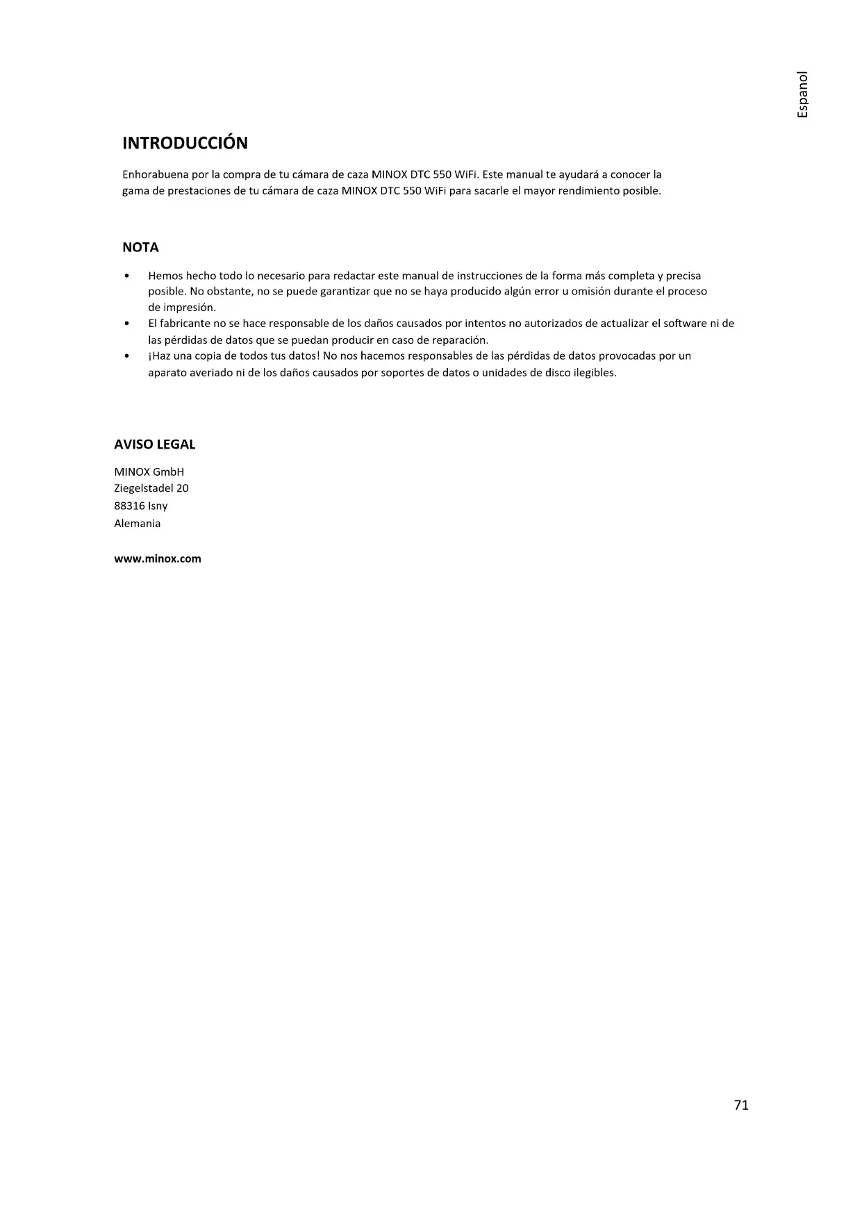 humidifié. Laissez ensuite sécher entièrement la caméra de surveillance.69 Espanol ÍNDICE Vista 70 Introducción 71 Generalidades 72 Características de la cámara de caza 73 Primera puesta en marcha 74 Manejo 76 Conexión con el ordenador 83 Aplicación MINOX WIFI TRAIL CAM 84 Solución de problemas 89 Datos técnicos 90 Almacenamiento 92 Limpieza 9270 Espanol71 Espanol INTRODUCCIÓN Enhorabuena por la compra de tu cámara de caza MINOX DTC 550 WiFi. Este manual te ayudará a conocer la gama de prestaciones de tu cámara de caza MINOX DTC 550 WiFi para sacarle el mayor rendimiento posible.