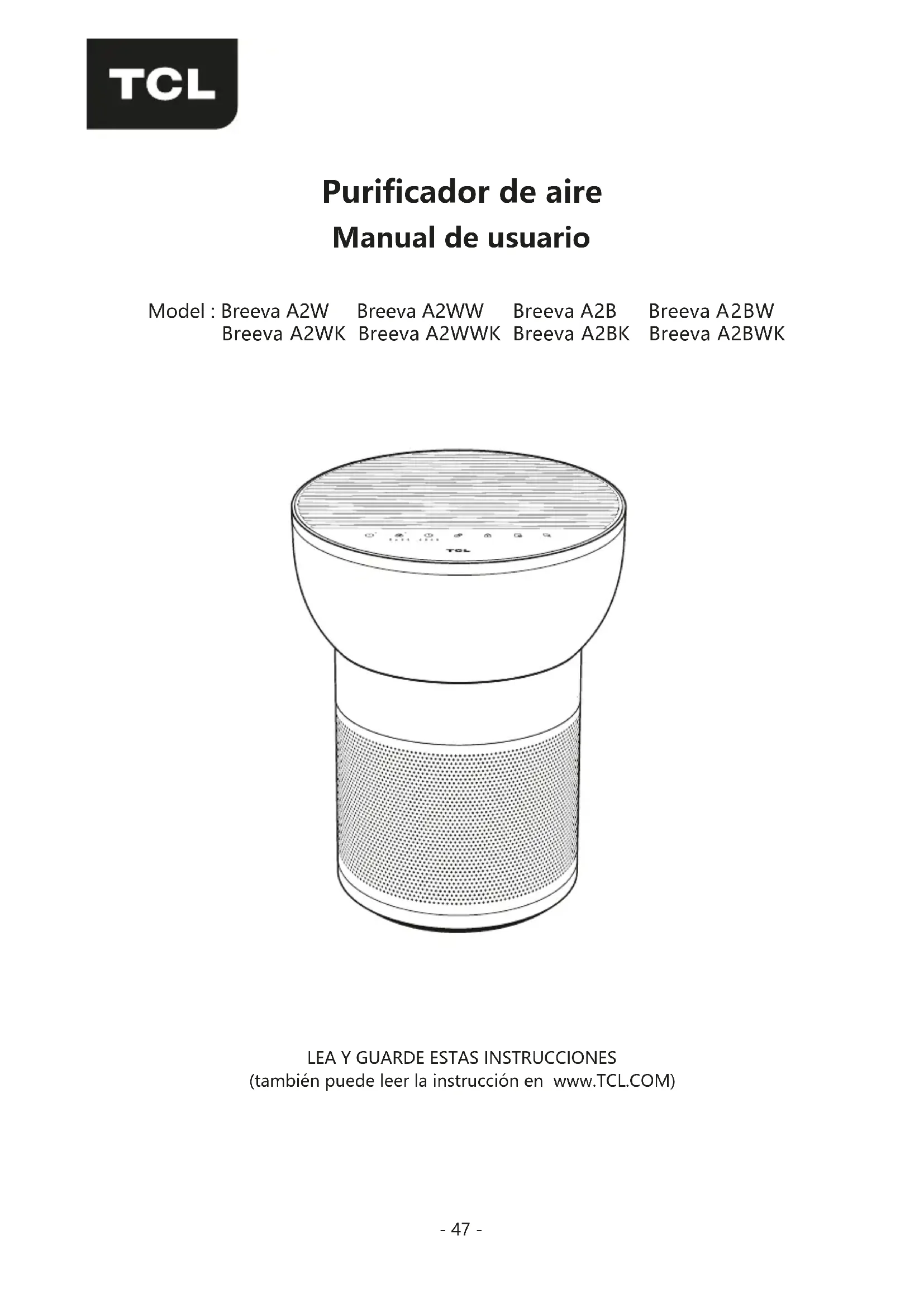 Breeva A2W - Purificador de aire TCL - Manual de uso y guía de instrucciones gratis