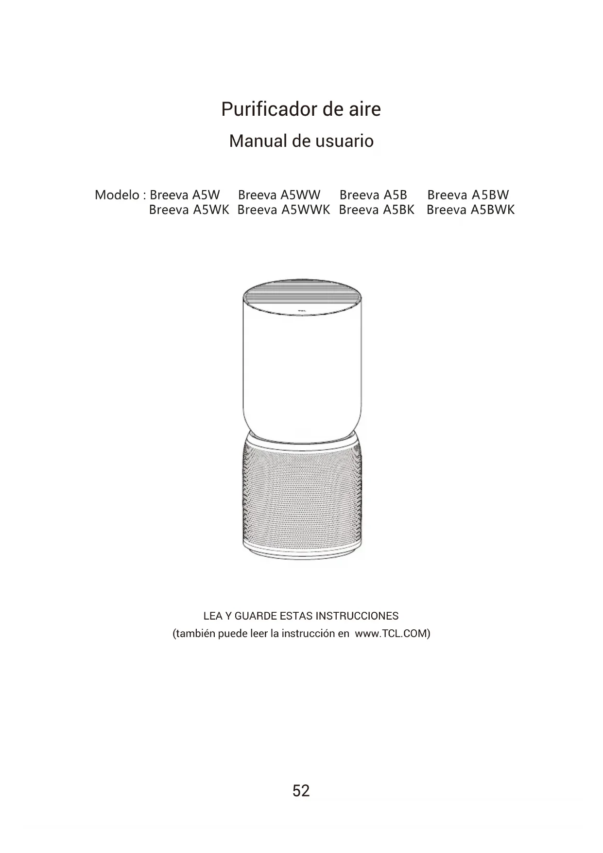 (también puede leer la instrucción en www.TCL.COM) Modelo : Breeva A5W Breeva A5WW Breeva A5B Breeva A5BW Breeva A5WK Breeva A5WWK Breeva A5BK Breeva A5BWKdescripción del producto lista del paquete nombre de cada parte precauciones de seguridad empezar panel de control instrucciones instrucciones de conexión de la aplicación mantenimiento solución de problemas especificaciones atenclÓn al cliente