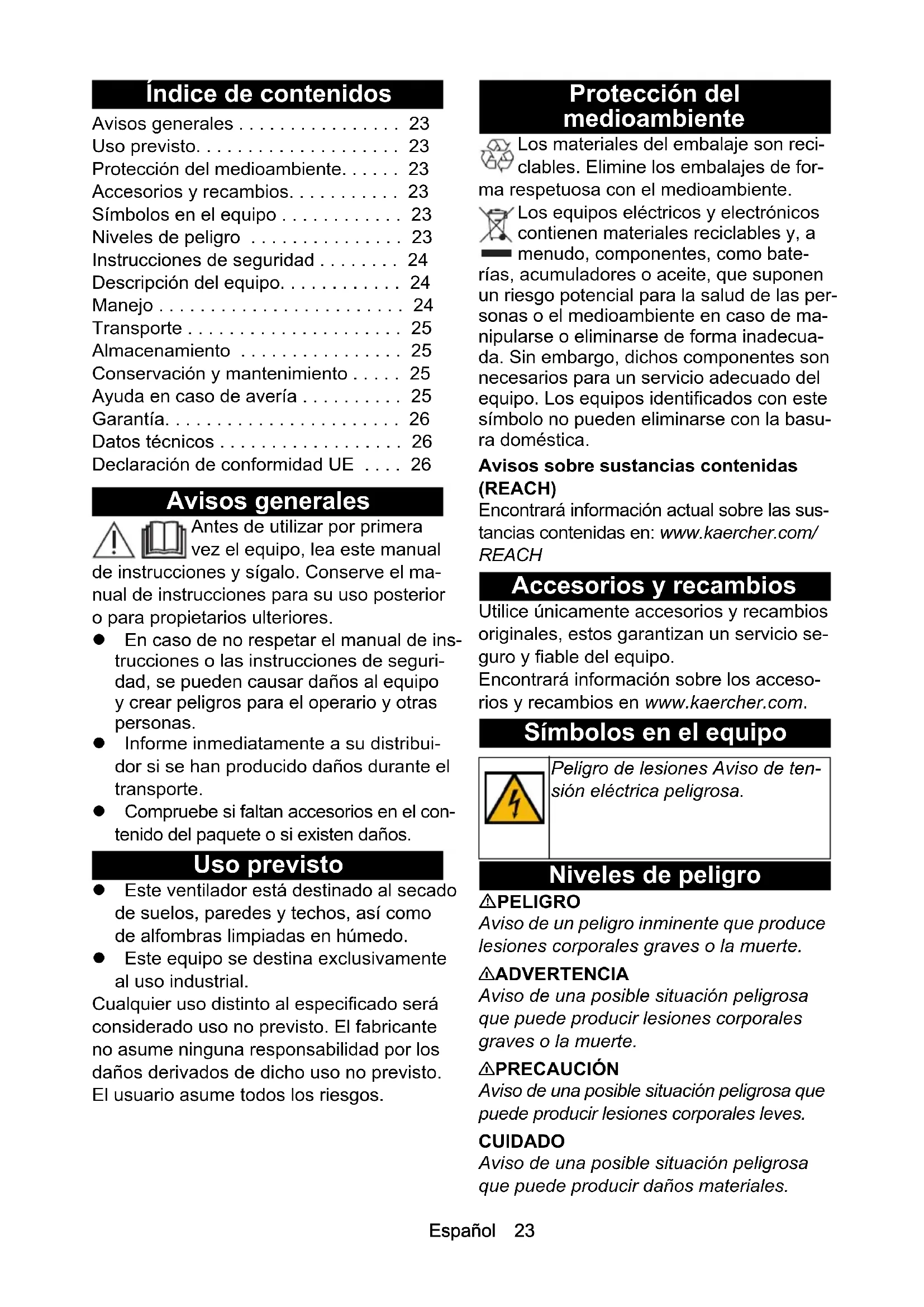 - Kabellengte (EU) m 7,5 Chairman of the Board of Management Director Regulatory Affairs & CertificationEspañol 23 Índice de contenidos Avisos generales Antes de utilizar por primera vez el equipo, lea este manual de instrucciones y sígalo. Conserve el ma- nual de instrucciones para su uso posterior o para propietarios ulteriores. En caso de no respetar el manual de ins- trucciones o las instrucciones de seguri- dad, se pueden causar daños al equipo y crear peligros para el operario y otras personas. Informe inmediatamente a su distribui- dor si se han producido daños durante el transporte. Compruebe si faltan accesorios en el con- tenido del paquete o si existen daños. Uso previsto Este ventilador está destinado al secado de suelos, paredes y techos, así como de alfombras limpiadas en húmedo. Este equipo se destina exclusivamente al uso industrial. Cualquier uso distinto al especificado será considerado uso no previsto. El fabricante no asume ninguna responsabilidad por los daños derivados de dicho uso no previsto. El usuario asume todos los riesgos. Protección del medioambiente Los materiales del embalaje son reci- clables. Elimine los embalajes de for- ma respetuosa con el medioambiente. Los equipos eléctricos y electrónicos contienen materiales reciclables y, a menudo, componentes, como bate- rías, acumuladores o aceite, que suponen un riesgo potencial para la salud de las per- sonas o el medioambiente en caso de ma- nipularse o eliminarse de forma inadecua- da. Sin embargo, dichos componentes son necesarios para un servicio adecuado del equipo. Los equipos identificados con este símbolo no pueden eliminarse con la basu- ra doméstica. Avisos sobre sustancias contenidas (REACH) Encontrará información actual sobre las sus- tancias contenidas en: www.kaercher.com/ REACH Accesorios y recambios Utilice únicamente accesorios y recambios originales, estos garantizan un servicio se- guro y fiable del equipo. Encontrará información sobre los acceso- rios y recambios en www.kaercher.com. Símbolos en el equipo Niveles de peligro PELIGRO Aviso de un peligro inminente que produce lesiones corporales graves o la muerte. 몇 ADVERTENCIA Aviso de una posible situación peligrosa que puede producir lesiones corporales graves o la muerte. 몇 PRECAUCIÓN Aviso de una posible situación peligrosa que puede producir lesiones corporales leves. CUIDADO Aviso de una posible situación peligrosa que puede producir daños materiales. Avisos generales p. 23