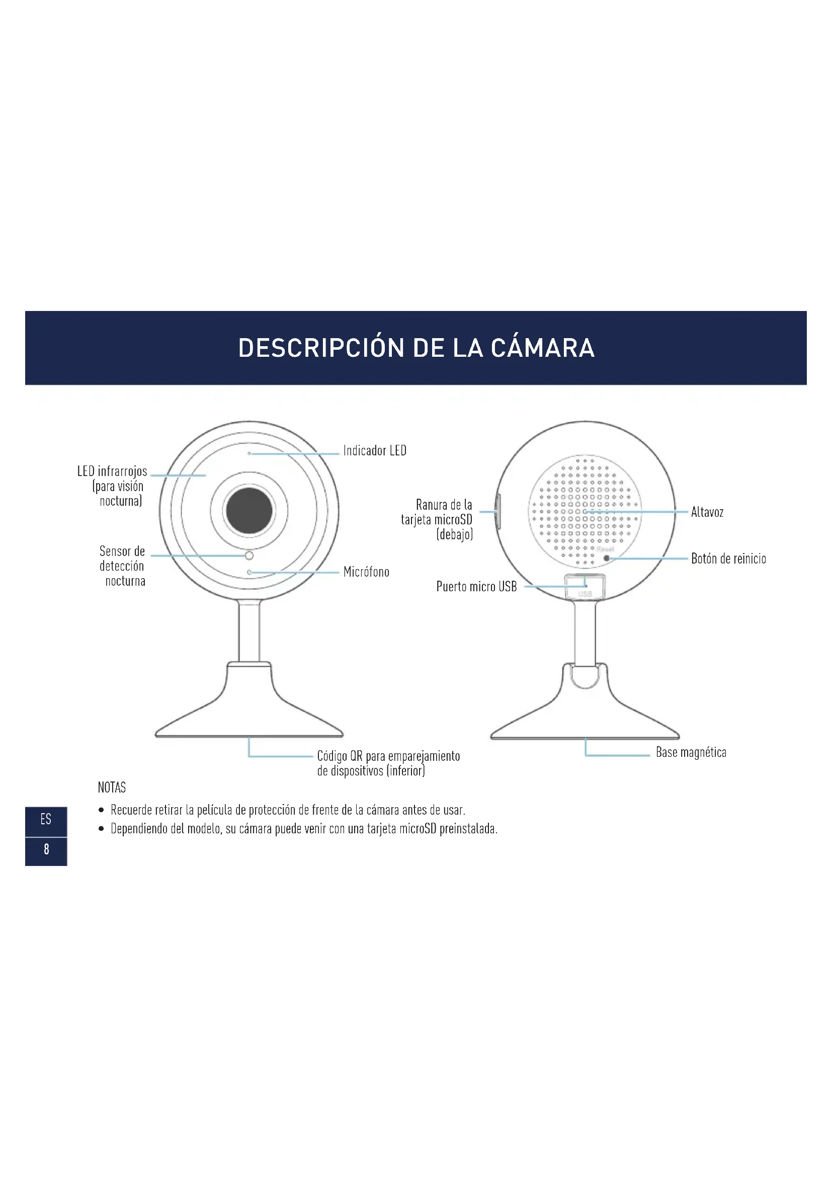 Sensor de detección nocturna Ranura de la tarjeta microSD (debajo) LED infrarrojos (para visión nocturna) Micrófono Base magnética Indicador LED Altavoz Botón de reinicio Puerto micro USB NOTAS