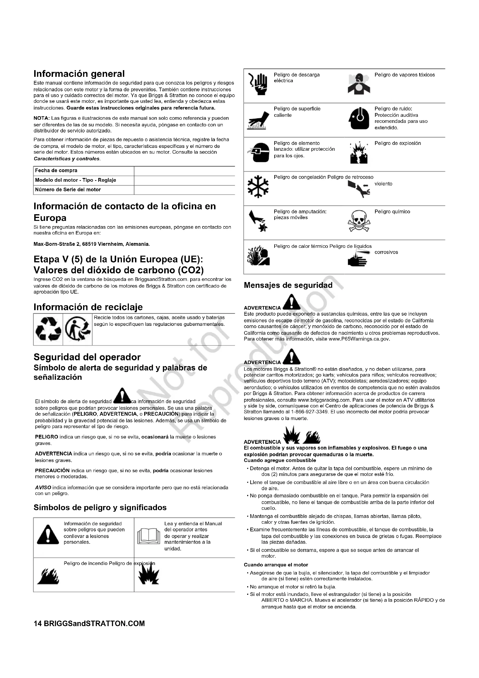 Este manual contiene informacion de seguridad para que conozca los peligos y riesgos relacionados con este motor y la forma de prevenirlos. Internacional contiene instruetiones para el uso y cuidado correctos del motor. Ya que Briggs & Stratton no conoce el equipo donte se usaque motor, es importante que ustede lea, entienda y obedezca estas instruetiones. Guarde estas instruetiones originales para referencia futura.