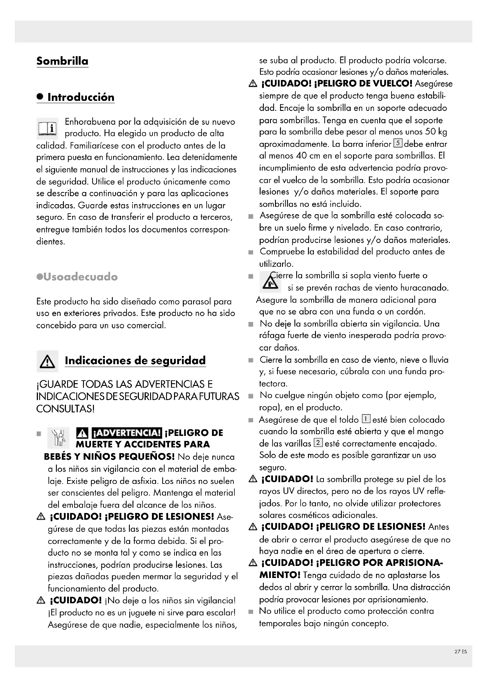 BEBÉS Y NIÑOS PEQUEÑOS! No deje nunca a los niños sin vigilancia con el material de emba- laje. Existe peligro de asfixia. Los niños no suelen ser conscientes del peligro. Mantenga el material del embalaje fuera del alcance de los niños. ¡CUIDADO! ¡PELIGRO DE LESIONES! Ase- gúrese de que todas las piezas están montadas correctamente y de la forma debida. Si el pro- ducto no se monta tal y como se indica en las instrucciones, podrían producirse lesiones. Las piezas dañadas pueden mermar la seguridad y el funcionamiento del producto. ¡CUIDADO! ¡No deje a los niños sin vigilancia! ¡El producto no es un juguete ni sirve para escalar! Asegúrese de que nadie, especialmente los niños, se suba al producto. El producto podría volcarse. Esto podría ocasionar lesiones y/o daños materiales. ¡CUIDADO! ¡PELIGRO DE VUELCO! Asegúrese siempre de que el producto tenga buena estabili- dad. Encaje la sombrilla en un soporte adecuado para sombrillas. Tenga en cuenta que el soporte para la sombrilla debe pesar al menos unos 50 kg aproximadamente. La barra inferior