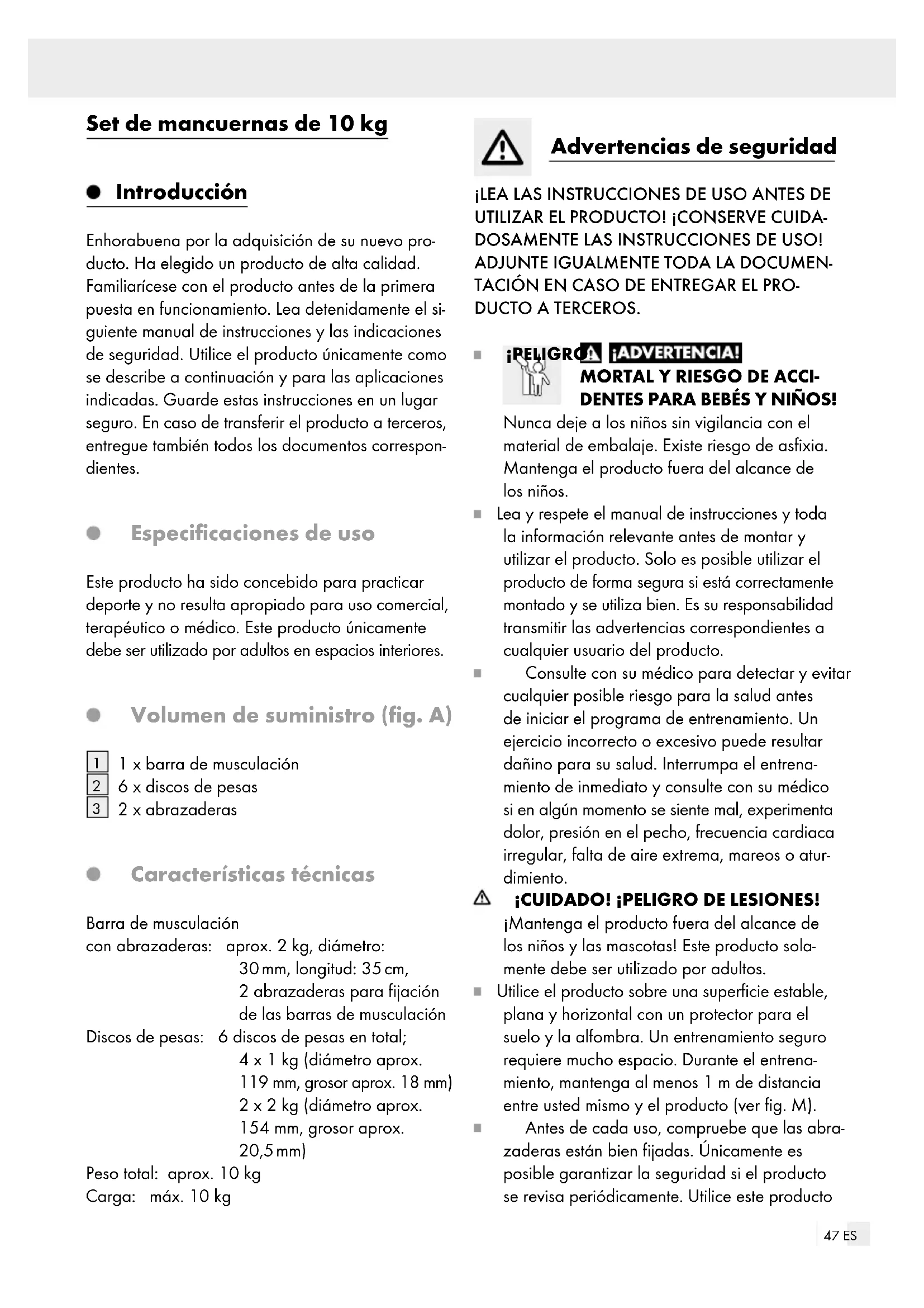 2 x abrazaderas Características técnicas Barra de musculación con abrazaderas: aprox. 2 kg, diámetro: 30 mm, longitud: 35 cm, 2 abrazaderas para fijación de las barras de musculación Discos de pesas: 6 discos de pesas en total; 4 x 1 kg (diámetro aprox. 119 mm, grosor aprox. 18 mm) 2 x 2 kg (diámetro aprox. 154 mm, grosor aprox. 20,5 mm) Peso total: aprox. 10 kg Carga: máx. 10 kg Advertencias de seguridad ¡LEA LAS INSTRUCCIONES DE USO ANTES DE