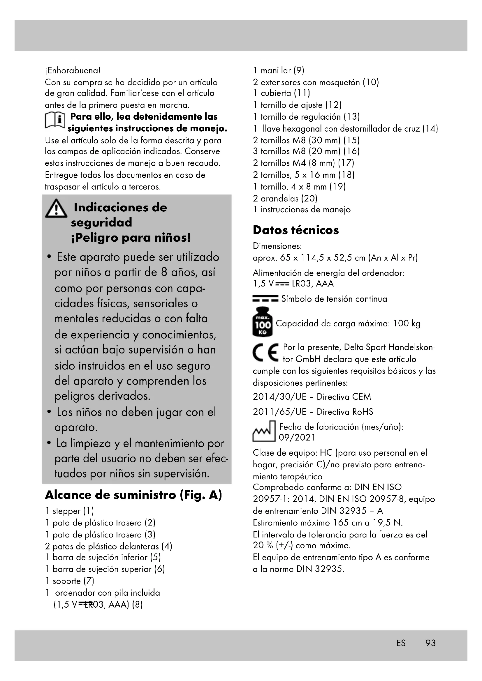 - La limpieza y el mantenimiento por parte del usuario no deben ser efec- tuados por niños sin supervisión. Alcance de suministro (Fig. A) 1 stepper (1) 1 pata de plástico trasera (2) 1 pata de plástico trasera (3) 2 patas de plástico delanteras (4) 1 barra de sujeción inferior (5) 1 barra de sujeción superior (6) 1 soporte (7) 1 ordenador con pila incluida (1,5 V LR03, AAA) (8) 1 manillar (9) 2 extensores con mosquetón (10) 1 cubierta (11) 1 tornillo de ajuste (12) 1 tornillo de regulación (13) 1 llave hexagonal con destornillador de cruz (14) 2 tornillos M8 (30 mm) (15) 3 tornillos M8 (20 mm) (16) 2 tornillos M4 (8 mm) (17) 2 tornillos, 5 x 16 mm (18) 1 tornillo, 4 x 8 mm (19) 2 arandelas (20) 1 instrucciones de manejo Datos técnicos Dimensiones: aprox. 65 x 114,5 x 52,5 cm (An x Al x Pr) Alimentación de energía del ordenador: 1,5 V LR03, AAA Símbolo de tensión continua Capacidad de carga máxima: 100 kg Por la presente, Delta-Sport Handelskon- tor GmbH declara que este artículo cumple con los siguientes requisitos básicos y las disposiciones pertinentes: 2014/30/UE – Directiva CEM 2011/65/UE – Directiva RoHS Fecha de fabricación (mes/año): 09/2021 Clase de equipo: HC (para uso personal en el hogar, precisión C)/no previsto para entrena- miento terapéutico Comprobado conforme a: DIN EN ISO 20957-1: 2014, DIN EN ISO 20957-8, equipo de entrenamiento DIN 32935 – A Estiramiento máximo 165 cm a 19,5 N. El intervalo de tolerancia para la fuerza es del 20 % (+/-) como máximo. El equipo de entrenamiento tipo A es conforme a la norma DIN 32935. ES94 Movimiento de marcha En este stepper, el movimiento realizado es de marcha dependiente. Sistema de resistencia de frenado En este stepper, el sistema es dependiente de la velocidad. Uso previsto El artículo es apto solo como aparato de entrenamiento. El artículo está concebido para uso privado y no es apto para fines médicos ni comerciales. El artículo es apto para su uso en interiores. Indicaciones de seguridad Peligro general