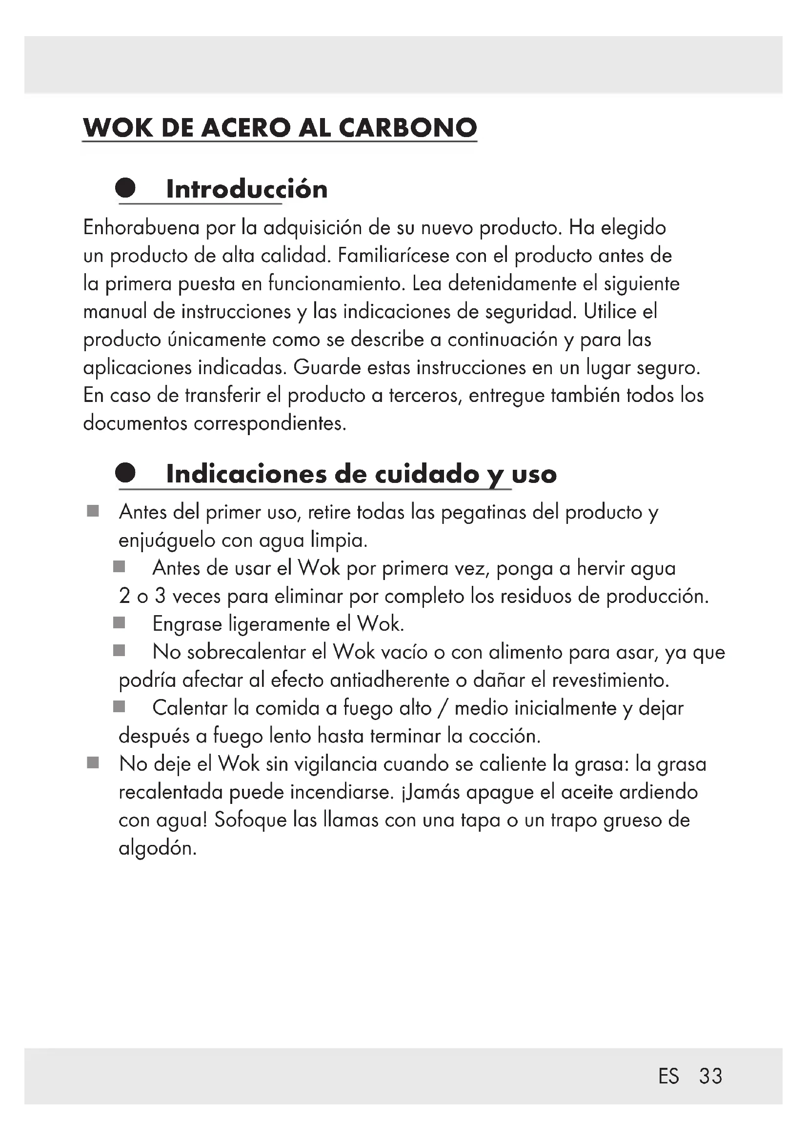 Introducción Enhorabuena por la adquisición de su nuevo producto. Ha elegido un producto de alta calidad. Familiarícese con el producto antes de la primera puesta en funcionamiento. Lea detenidamente el siguiente manual de instrucciones y las indicaciones de seguridad. Utilice el producto únicamente como se describe a continuación y para las aplicaciones indicadas. Guarde estas instrucciones en un lugar seguro. En caso de transferir el producto a terceros, entregue también todos los documentos correspondientes. Indicaciones de cuidado y uso Antes del primer uso, retire todas las pegatinas del producto y enjuáguelo con agua limpia. Antes de usar el Wok por primera vez, ponga a hervir agua 2o3veces para eliminar por completo los residuos de producción. Engrase ligeramente el Wok. No sobrecalentar el Wok vacío o con alimento para asar, ya que podría afectar al efecto antiadherente o dañar el revestimiento. Calentar la comida a fuego alto/ medio inicialmente y dejar después a fuego lento hasta terminar la cocción. No deje el Wok sin vigilancia cuando se caliente la grasa: la grasa recalentada puede incendiarse. ¡Jamás apague el aceite ardiendo con agua! Sofoque las llamas con una tapa o un trapo grueso de algodón.34 ES Utilice solamente utensilios de cocina de plástico o madera, para no dañar el recubrimiento antiadherente. No poner en el Wok carne que gotee. Las salpicaduras de grasa sobre una placa de cocina incandescente pueden provocar un incendio. El mango de la sartén puede calentarse durante la cocción. Para su protección, use un trapo de cocina o guantes de horno. El Wok es apto para cocinas eléctricas y de gas. El Wok no es apto para el horno. No es resistente al horno. Seleccione la superficie de cocción de acuerdo con el diámetro del Wok para evitar la pérdida de calor. Este Wok no es apto para el lavavajillas. Evitar el uso de objetos afilados, puntiagudos o de cepillos, para no dañar el material. Nunca ponga el producto caliente bajo el chorro de agua fría. Utilice agua caliente con un detergente normal para limpiar a mano el producto. La limpieza frecuente con productos de limpieza agresivos puede dañar y/ o decolorar el Wok. Seguridad alimentaria: Este Wok no influye ni el sabor ni en el olor de los alimentos cocinados. Nunca utilice el Wok si las asas están sueltas.35ES Eliminación El embalaje está compuesto por materiales no contaminantes que pueden ser desechados en el centro de reciclaje local. Para obtener información sobre las posibilidades de desecho del producto al final de su vida útil, acuda a la administración de su comunidad o ciudad. Garantía El producto ha sido fabricado cuidadosamente siguiendo exigentes normas de calidad y ha sido probado antes de su entrega. En caso de defecto del producto, usted tiene derechos legales frente al vendedor del mismo. Nuestra garantía (abajo indicada) no supone una restricción de dichos derechos legales. Este producto dispone de una garantía de 3 años desde la fecha de compra. El plazo de garantía comienza a partir de la fecha de compra. Por favor, conserve adecuadamente el justificante de compra original. Este documento se requerirá como prueba de que se realizó la compra. Si en el plazo de 3 años a partir de la fecha de compra se produce un fallo de material o fabricación en este producto, repararemos el producto o lo sustituiremos gratuitamente por un producto nuevo (según nuestra elección). La garantía quedará anulada si el producto resulta dañado o es utilizado o mantenido de forma inadecuada. La garantía cubre defectos de materiales o de fabricación. Esta garantía no cubre aquellos componentes del producto sometidos a un desgaste normal y que, por ello, puedan considerarse piezas de desgaste (por ej. las pilas). Tampoco cubre daños de componentes frágiles como, por ejemplo, los interruptores, baterías y piezas de cristal.36 ES Tramitación de la garantía Para garantizar una rápida tramitación de su consulta, tenga en cuenta las siguientes indicaciones: Para realizar cualquier consulta, tenga a mano el recibo y el número de artículo (por ej. IAN 123456_7890) como justificante de compra. Encontrará el número de artículo en una inscripción de la placa indentificativa, en la portada de las instrucciones (abajo a la izquierda) o en una pegatina en la parte posterior o inferior. Si el producto fallase o presentase algún defecto, póngase primero en contacto con el departamento de asistencia indicado, ya sea por teléfono o correo electrónico. Puede enviarnos el producto defectuoso libre de franqueo adjuntando el recibo de compra (tícket de compra) e indicando dónde está y cuándo ha ocurrido el fallo a la dirección de asistencia que le indicamos. Asistencia Asistencia en España Tel.: 900984948 E-Mail: owim@lidl.es37