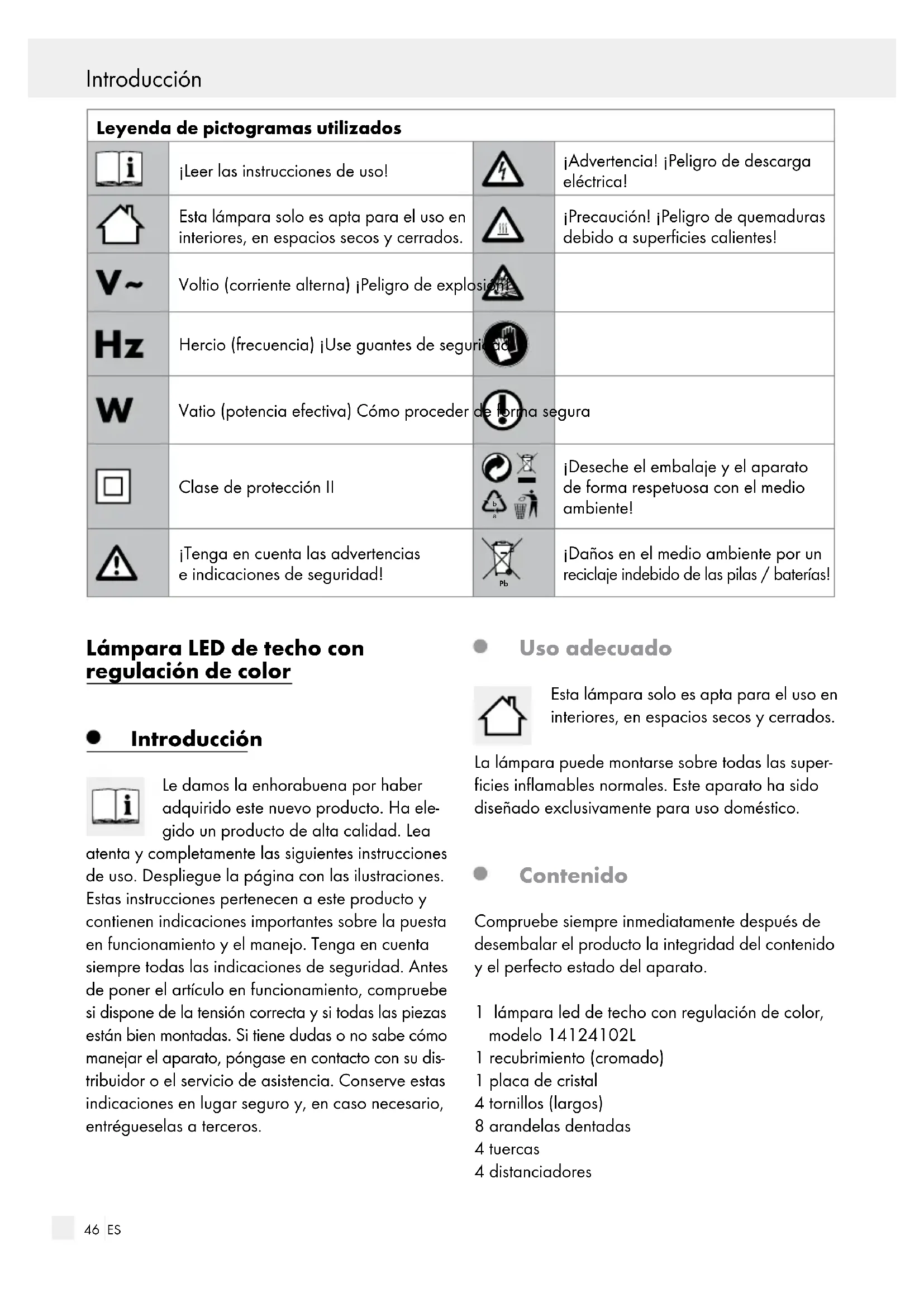 Arandela (goma, grande) Características técnicas N.º de modelo: 14124102L Tensión de funcionamiento: 230–240 V∼ 50 Hz Bombilla: LEDs (no reemplazables) Potencia nominal: 20 W Clase de protección: II / Grado de protección: IP20 (apropiado exclu- sivamente para su uso en interiores) Mando a distancia: Pilas: 2 x 1,5 V AAA Seguridad Indicaciones de seguridad ¡El derecho de garantía quedará anulado en caso de producirse daños por no tener en cuenta estas instrucciones de uso! ¡No se asumirá responsabili- dad alguna por daños indirectos! En caso de que el manejo inadecuado del producto o el incumpli- miento de las indicaciones de seguridad provoquen daños materiales o personales, ¡no se asumirá nin- guna responsabilidad! No deje la lámpara ni el material de embalaje sin supervisión. Las láminas y bolsas de plástico, las piezas de plástico, etc., pueden convertirse en juguetes peligrosos para los niños. Cómo evitar el peligro de muerte por descarga eléctrica La instalación eléctrica la debe realizar un elec- tricista formado o una persona instruida en ins- talaciones eléctricas. Antes de conectar el aparato a la red, compr uebe que la lámpara y el cable estén en perfecto es- tado. Nunca utilice la lámpara si detecta algún tipo de daño. Los cables de red dañados conllevan peligro de muerte por descarga eléctrica. En caso de daños, reparaciones u otros problemas en la lámpara, diríjase al servicio de mantenimiento o a un técnico electricista. Antes del montaje, retire el fusible o desconecte el interruptor automático de la caja de fusibles (posición 0). Asegúrese antes de cada montaje de que la corriente nominal disponible coincida con la tensión de funcionamiento necesaria de la lám- para (consultar „Características técnicas“). Evite que la lámpara entre en contacto con agua u otros líquidos. Nunca abra el equipo eléctrico ni introduzca objetos en el mismo. Esto puede suponer peligro de muerte por descarga eléctrica.48 ES Seguridad ¡No instalar la lámpara sobre una superficie húmeda o conductora! Cómo prevenir incendios y lesiones ¡RIESGO DE LESIONES! Compruebe el estado de cada vidrio y bombilla inmediatamente después de desempaquetar. No monte la lámpara con bombillas y / o vidrios defectuosos. En este caso, póngase en contacto con el servicio de mantenimiento para su susti- tución. No mire directamente al foco de luz (bombilla, LED, etc.).