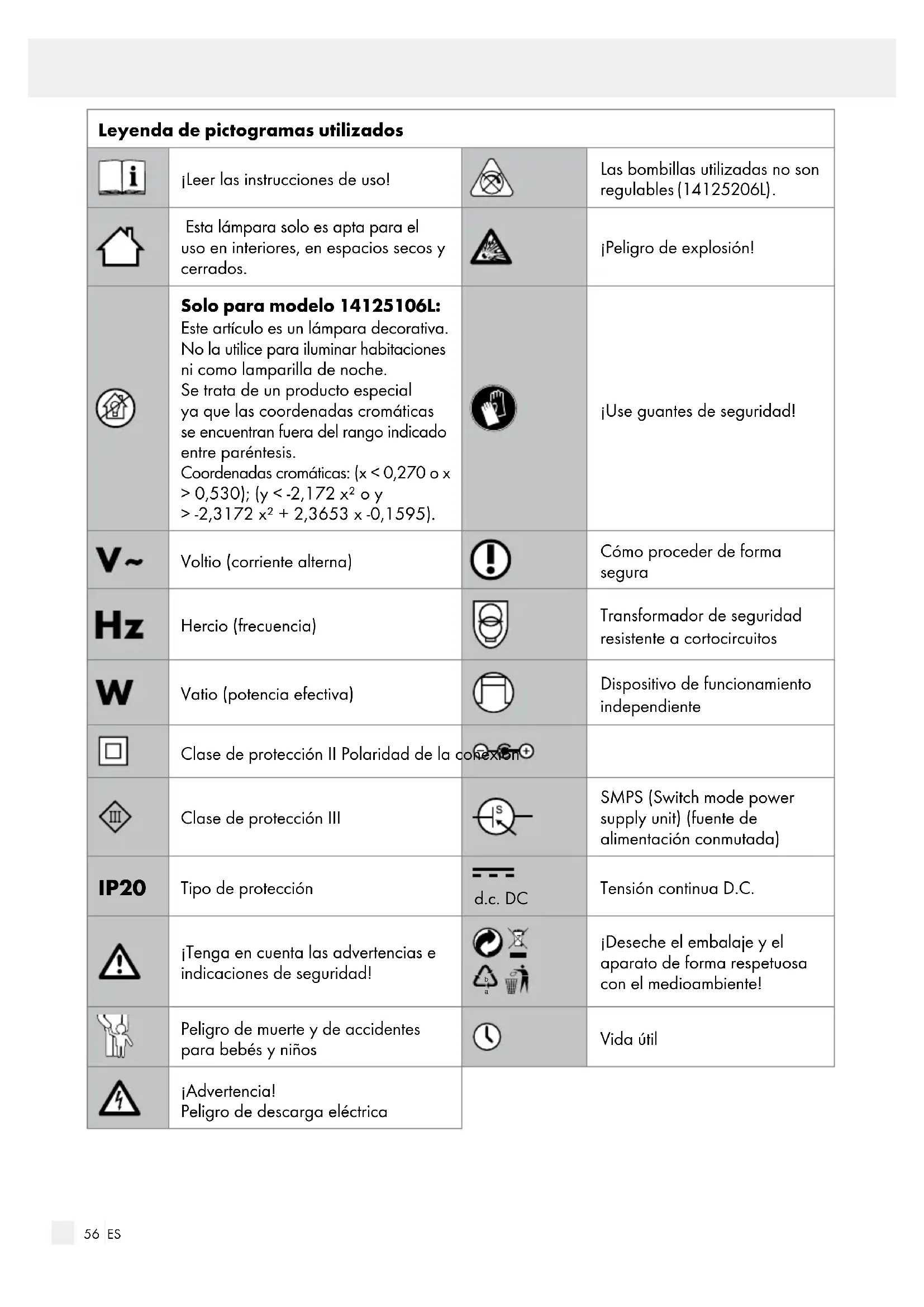 Esta lámpara solo es apta para el uso en interiores, en espacios secos y cerrados. ¡Peligro de explosión! Solo para modelo 14125106L: Este artículo es un lámpara decorativa. No la utilice para iluminar habitaciones ni como lamparilla de noche. Se trata de un producto especial ya que las coordenadas cromáticas se encuentran fuera del rango indicado entre paréntesis. Coordenadas cromáticas: (x < 0,270 o x > 0,530); (y < -2,172 x² o y > -2,3172 x² + 2,3653 x -0,1595). ¡Use guantes de seguridad! Voltio (corriente alterna) Cómo proceder de forma segura Hercio (frecuencia) Transformador de seguridad resistente a cortocircuitos Vatio (potencia efectiva) Dispositivo de funcionamiento independiente Clase de protección II Polaridad de la conexión Clase de protección III SMPS (Switch mode power supply unit) (fuente de alimentación conmutada) IP20 Tipo de protección d.c. DC Tensión continua D.C. ¡Tenga en cuenta las advertencias e indicaciones de seguridad!