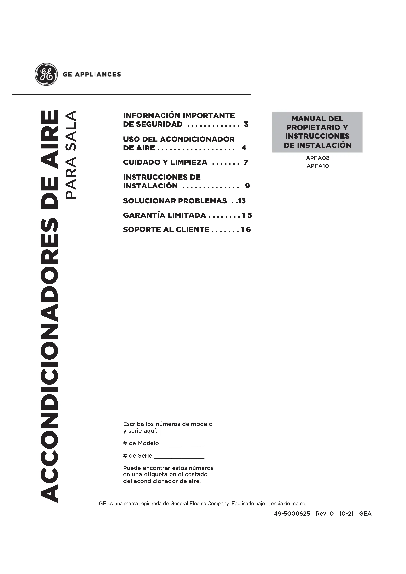 PARA SALA Escriba los números de modelo y serie aquí: # de Modelo _____________ # de Serie _______________ Puede encontrar estos números en una etiqueta en el costado del acondicionador de aire. GE es una marca registrada de General Electric Company. Fabricado bajo licencia de marca. MANUAL DEL PROPIETARIO Y INSTRUCCIONES