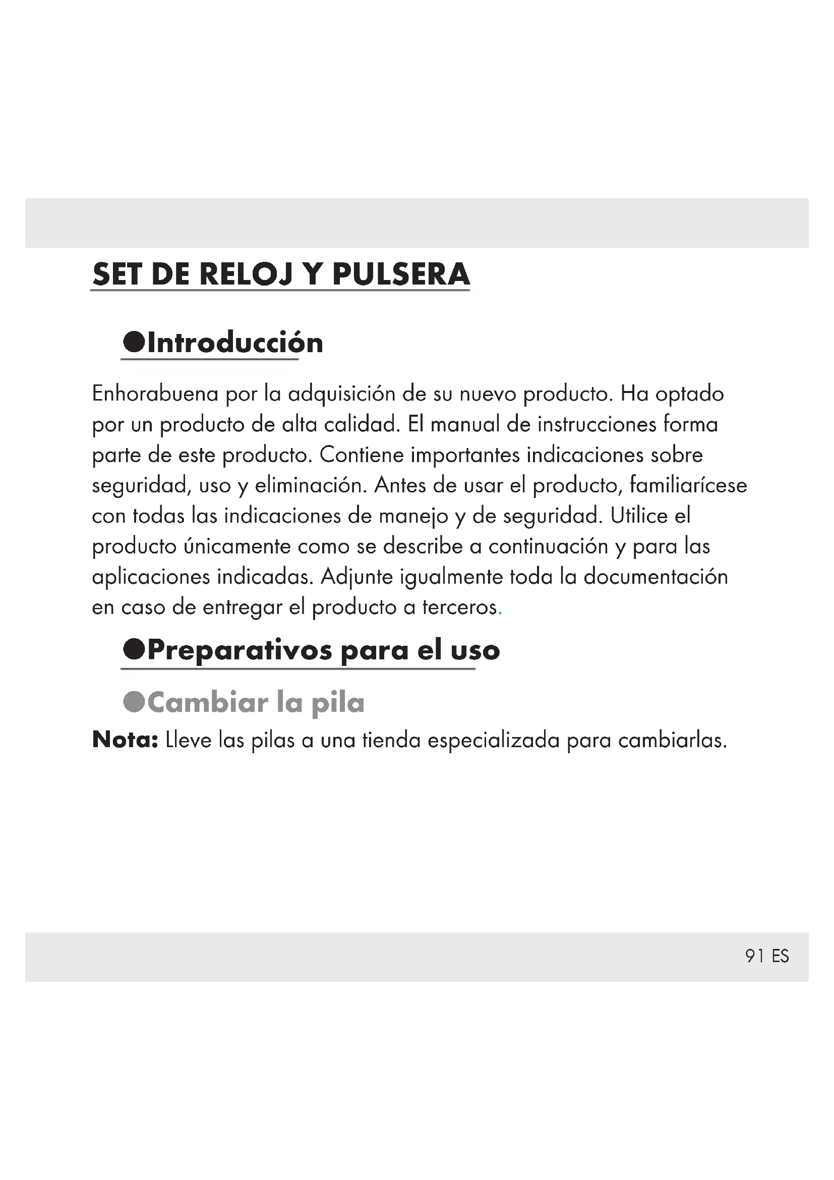 P Introducción Enhorabuena por la adquisición de su nuevo producto. Ha optado por un producto de alta calidad. El manual de instrucciones forma parte de este producto. Contiene importantes indicaciones sobre seguridad, uso y eliminación. Antes de usar el producto, familiarícese con todas las indicaciones de manejo y de seguridad. Utilice el producto únicamente como se describe a continuación y para las aplicaciones indicadas. Adjunte igualmente toda la documentación en caso de entregar el producto a terceros. P Preparativos para el uso P Cambiar la pila Nota: Lleve las pilas a una tienda especializada para cambiarlas.92 ES P Pantalla