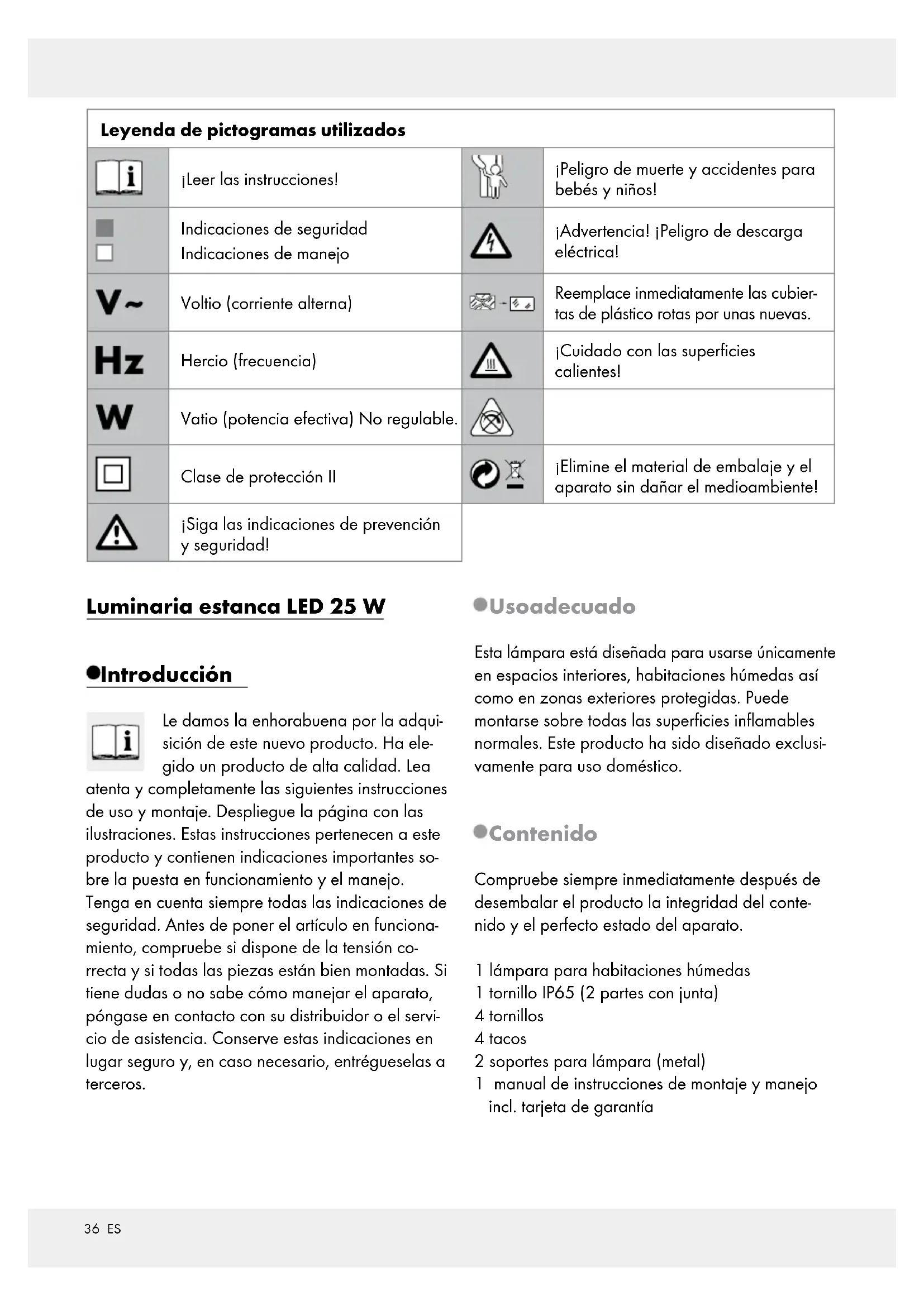 Jestliže se nejedná o uplatnění záruky: Prosím, zašlete neopravený artikl zpět za vzniklé náklady na přepravu. Informujte mě o nákladech. Opravte artikl za úhradu. Záruka / Servis35 ES Leyenda de pictogramas utilizados ..................................................................... Página 36 Introducción .............................................................................................................................. Página 36 Uso adecuado ................................................................................................................................ Página 36 Contenido ........................................................................................................................................ Página 36 Descripción de las piezas .............................................................................................................. Página 37 Características técnicas .................................................................................................................. Página 37 Seguridad ................................................................................................................................... Página 37 Indicaciones de seguridad ............................................................................................................. Página 37 Preparativos ............................................................................................................................. Página 38 Herramientas y materiales necesarios ........................................................................................... Página 38 Antes de la instalación ..................................................................................................... Página 38 Puesta en funcionamiento ............................................................................................ Página 38 Cómo montar la lámpara ............................................................................................................... Página 38 Cómo encender / apagar la lámpara ........................................................................................... Página 39 Mantenimiento y limpieza............................................................................................ Página 39 Desecho del producto ....................................................................................................... Página 39 Declaración de conformidad ...................................................................................... Página 39 Garantía / Atención al cliente ..................................................................................... Página 40 Garantía .......................................................................................................................................... Página 40 Dirección del servicio técnico ......................................................................................................... Página 40 Garantía .......................................................................................................................................... Página 40 ÍndiceZáruka / Servis36 ES Introducción / Seguridad Introducción Luminaria estanca LED 25 W Introducción Le damos la enhorabuena por la adqui- sición de este nuevo producto. Ha ele- gido un producto de alta calidad. Lea atenta y completamente las siguientes instrucciones de uso y montaje. Despliegue la página con las ilustraciones. Estas instrucciones pertenecen a este producto y contienen indicaciones importantes so- bre la puesta en funcionamiento y el manejo. Tenga en cuenta siempre todas las indicaciones de seguridad. Antes de poner el artículo en funciona- miento, compruebe si dispone de la tensión co- rrecta y si todas las piezas están bien montadas. Si tiene dudas o no sabe cómo manejar el aparato, póngase en contacto con su distribuidor o el servi- cio de asistencia. Conserve estas indicaciones en lugar seguro y, en caso necesario, entrégueselas a terceros. Uso adecuado Esta lámpara está diseñada para usarse únicamente en espacios interiores, habitaciones húmedas así como en zonas exteriores protegidas. Puede montarse sobre todas las superficies inflamables normales. Este producto ha sido diseñado exclusi- vamente para uso doméstico. Contenido Compruebe siempre inmediatamente después de desembalar el producto la integridad del conte- nido y el perfecto estado del aparato. 1 lámpara para habitaciones húmedas 1 tornillo IP65 (2 partes con junta) 4 tornillos 4 tacos 2 soportes para lámpara (metal) 1 manual de instrucciones de montaje y manejo incl. tarjeta de garantía Leyenda de pictogramas utilizados ¡Leer las instrucciones! ¡Peligro de muerte y accidentes para bebés y niños! Indicaciones de seguridad Indicaciones de manejo ¡Advertencia! ¡Peligro de descarga eléctrica! Voltio (corriente alterna) Reemplace inmediatamente las cubier- tas de plástico rotas por unas nuevas. Hercio (frecuencia) ¡Cuidado con las superficies calientes! Vatio (potencia efectiva) No regulable. Clase de protección II ¡Elimine el material de embalaje y el aparato sin dañar el medioambiente! ¡Siga las indicaciones de prevención y seguridad!37 ES Introducción / Seguridad Introducción Descripción de las piezas