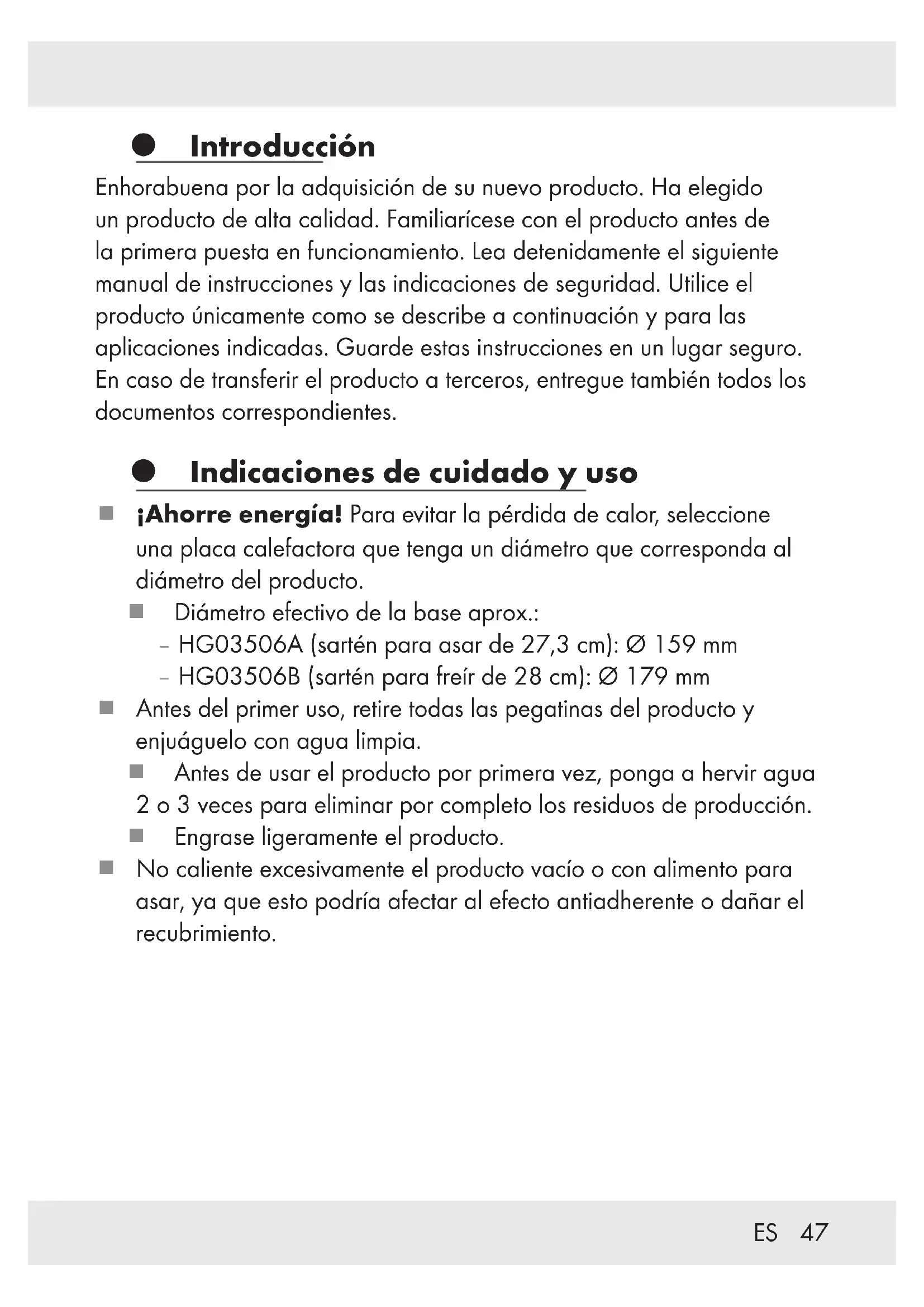 Introducción Enhorabuena por la adquisición de su nuevo producto. Ha elegido un producto de alta calidad. Familiarícese con el producto antes de la primera puesta en funcionamiento. Lea detenidamente el siguiente manual de instrucciones y las indicaciones de seguridad. Utilice el producto únicamente como se describe a continuación y para las aplicaciones indicadas. Guarde estas instrucciones en un lugar seguro. En caso de transferir el producto a terceros, entregue también todos los documentos correspondientes. Indicaciones de cuidado y uso ¡Ahorre energía! Para evitar la pérdida de calor, seleccione una placa calefactora que tenga un diámetro que corresponda al diámetro del producto. Diámetro efectivo de la base aprox.: – HG03506A (sartén para asar de 27,3 cm): Ø 159 mm – HG03506B (sartén para freír de 28 cm): Ø 179 mm Antes del primer uso, retire todas las pegatinas del producto y enjuáguelo con agua limpia. Antes de usar el producto por primera vez, ponga a hervir agua 2o3veces para eliminar por completo los residuos de producción. Engrase ligeramente el producto. No caliente excesivamente el producto vacío o con alimento para asar, ya que esto podría afectar al efecto antiadherente o dañar el recubrimiento.48 ES ¡Peligro de sobrecalentamiento! Si el utensilio de cocina no está engrasado y se calienta excesivamente, al ocurrir el contacto con alimentos sin grasa las proteínas presentes en los alimentos se quemarían, lo que puede causar la decoloración de la capa antiadherente. Estas decoloraciones se consideran como marcas de uso y no afectan a la calidad del recubrimiento ni a su idoneidad para el uso. Caliente la comida a fuego alto/ medio inicialmente y déjela después a fuego lento hasta terminar la cocción. No deje el producto sin vigilancia cuando se caliente la grasa: La grasa sobrecalentada puede incendiarse. ¡Jamás apague la grasa ardiendo con agua! Apague las llamas con una tapa o una manta densa. Utilice solamente utensilios de cocina de plástico o madera, para no dañar la capa antiadherente. No corte el alimento directamente en el producto. No coloque carne demasiado húmeda en el producto. Las salpicaduras de grasa sobre una placa de cocina incandescente pueden provocar un incendio. El mango de la sartén puede calentarse durante la cocción. Para su protección, use un agarrador o guantes de horno. El producto es adecuado para cocinas de gas, eléctricas, vitrocerámica, de inducción y de superficies halógenas.49ES Nota para las placas de inducción: En determinadas circunstancias puede escucharse un ruido que es debido a las propiedades electromagnéticas de la fuente de calor y del producto. Esto es normal y no hace referencia a un defecto de su placa de inducción o del producto. El producto debe colocarse en el centro de la placa de inducción. ¡ATENCIÓN! ¡Alta velocidad de calentamiento! No sobrecalentar el producto durante el precalentamiento. En caso de sobrecalentamiento del producto, debe airearse bien el espacio. Este producto combina las ventajas de los utensilios de cocina de aluminio, como el bajo peso y la alta conductividad térmica, con las ventajas de la cocina con inducción. Para posibilitar esto, elementos de acero magnéticos fueron insertados en la base de aluminio. Por ello el fondo no es siempre magnético, y puede no responder en aquellas placas de inducción, que significativamente excedan el diámetro de la base. Esto no es un defecto de calidad y no interfiere en el funcionamiento. Para que el producto funcione correctamente, colóquelo siempre sobre una placa de cocción que corresponda al diámetro efectivo de la base indicado en este manual de instrucciones. Las altas temperaturas pueden decolorar la parte exterior del producto. Esto no es ningún defecto de material y no afecta a la calidad o funcionalidad del producto. Nunca ponga el producto caliente bajo un chorro de agua fría. La parte inferior del producto podría dañarse o despegarse del producto.50 ES El producto es apropiado para mantener caliente los alimentos en el horno (máx.160°C durante1hora). Este producto es apto para lavavajillas. Para la limpieza manual, utilice agua caliente y un detergente lavavajillas común. Evite el uso de objetos afilados, puntiagudos o de cepillos, para no dañar el material. No use productos abrasivos para limpiar. La limpieza frecuente con productos de limpieza abrasivos puede dañar y/o decolorar el producto. La limpieza en el lavavajillas puede causar decoloración de las piezas de aluminio. ¡ATENCIÓN! ¡ARAÑAZOS! ¡Evite las rozaduras del producto sobre vitrocerámicas! Antes de empezar a cocinar, le recomendamos que limpie la superficie de la placa de cocción y el fondo del producto con un paño limpio y sin pelusas (por ejemplo, microfibra). Así puede evitar arañazos. Seguridad alimentaria: Este producto no influye ni en el sabor ni en el olor de los alimentos preparados. No utilice el producto si el mango está suelto. Si es necesario vuelva a apretar la atornilladura del mango. Eliminación El embalaje está compuesto por materiales no contaminantes que pueden ser desechados en el centro de reciclaje local. Para obtener información sobre las posibilidades de desecho del producto al final de su vida útil, acuda a la administración de su comunidad o ciudad.51ES Garantía El producto ha sido fabricado cuidadosamente siguiendo exigentes normas de calidad y ha sido probado antes de su entrega. En caso de defecto del producto, usted tiene derechos legales frente al vendedor del mismo. Nuestra garantía (abajo indicada) no supone una restricción de dichos derechos legales. Este producto dispone de una garantía de 3 años desde la fecha de compra. El plazo de garantía comienza a partir de la fecha de compra. Por favor, conserve adecuadamente el justificante de compra original. Este documento se requerirá como prueba de que se realizó la compra. Si en el plazo de 3 años a partir de la fech