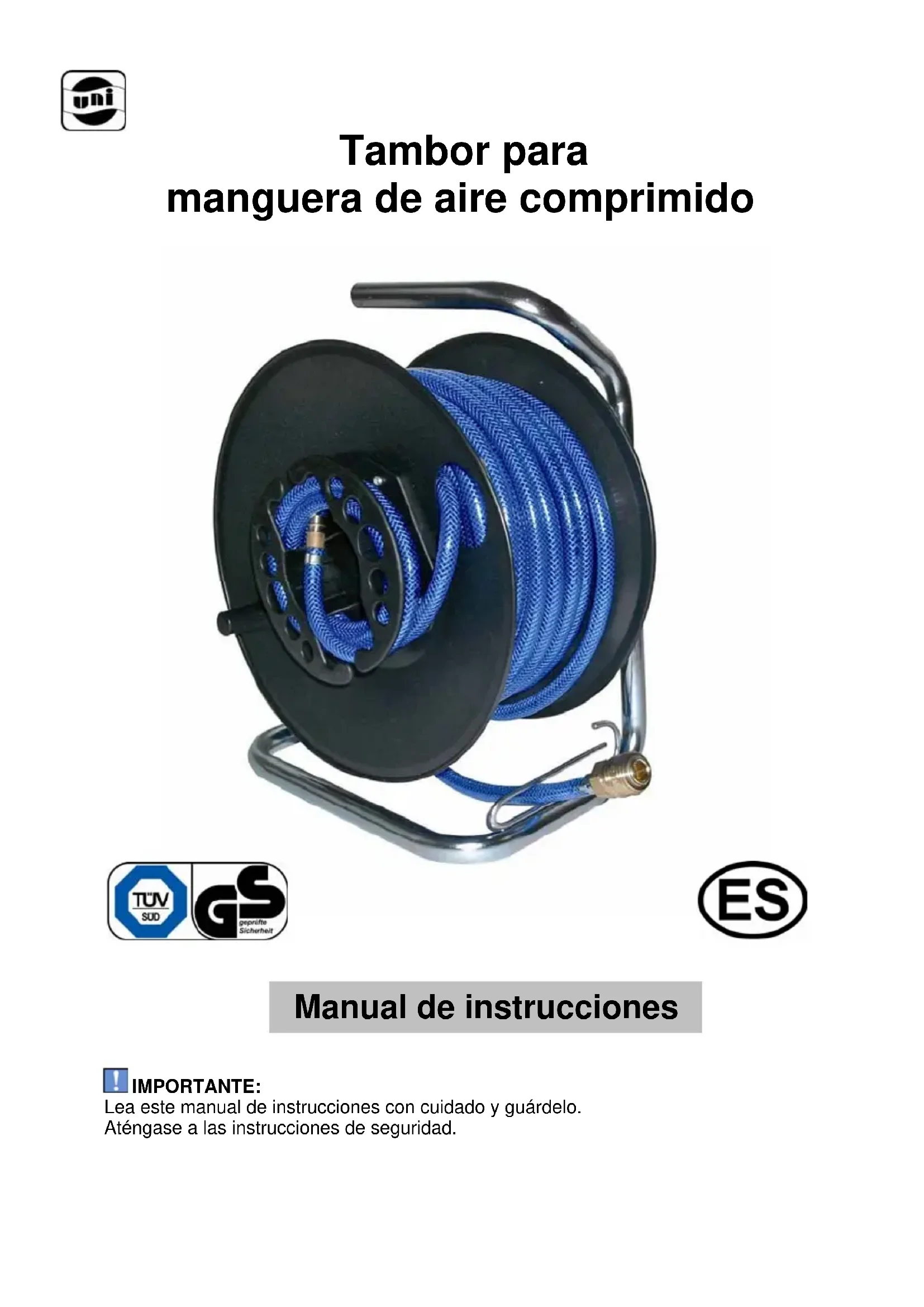 8 Lista de fallos Página 36 9 Limpieza Página 37 10 Mantenimiento Página 37 11 Desecho / reciclaje Página 37 12 Garantía y asistencia Página 37 13 Certificado y fabricante Página 37Tambor para manguera de aire comprimido ES 10049 Manual de instrucciones BK-64584 34 Act: 10049-04-2011_rev.1 1 Introducción Toda persona que utilice este producto, lo limpie o lo deseche como residuo está obligada a leer el presente manual de instrucciones. El producto deberá ir acompañado siempre por este manual de instrucciones. Aténgase siempre a todas las instrucciones de seguridad. Si tiene alguna pregunta, consulte a su distribuidor especializado o la oficina de asistencia (la dirección figura en el Capítulo 12). 2 Uso estipulado Este tambor para manguera de aire comprimido está pensado para uso universal en el taller, en el jardín, en trabajos de renovación o trabajos en el auto. Pueden utilizarse todos los aparatos de aire comprimido convencionales. No se contempla ningún otro fin para este producto que el estipulado en este manual de instrucciones. Si se utiliza para otro fin, el producto se daña. 3 Instrucciones de seguridad IMPORTANTE: Antes de usar el tambor para manguera de aire comprimido tenga en cuenta las siguientes indicaciones. De este modo se minimizan los peligros a personas y los daños materiales. Se declinará la garantía en caso de que surjan daños por la no observancia de este manual de instrucciones. No se asume responsabilidad alguna por los daños causados a personas ni a cosas ni por los daños consecuenciales que de ello resulte. Las palabras clave y los símbolos que se emplean en este manual tienen la siguiente lectura: Símbolo Palabra clave / Significado PELIGRO: Riesgo muy elevado de causar lesiones a personas o de correr peligro de muerte si no se observan las instrucciones correspondientes ADVERTENCIA: Riesgo moderado de lesiones en personas si no se observan las instrucciones correspondientes PRECAUCIÓN: Bajo riesgo de lesiones en personas, peligro de sufrir daños materiales o de que el producto sufra averías IMPORTANTE: A tener en cuenta NOTA: Informaciones más detalladas Tabla 1. Tabla de símbolos PRECAUCIÓN: En caso contrario, se corre el riesgo de sufrir lesiones medios.