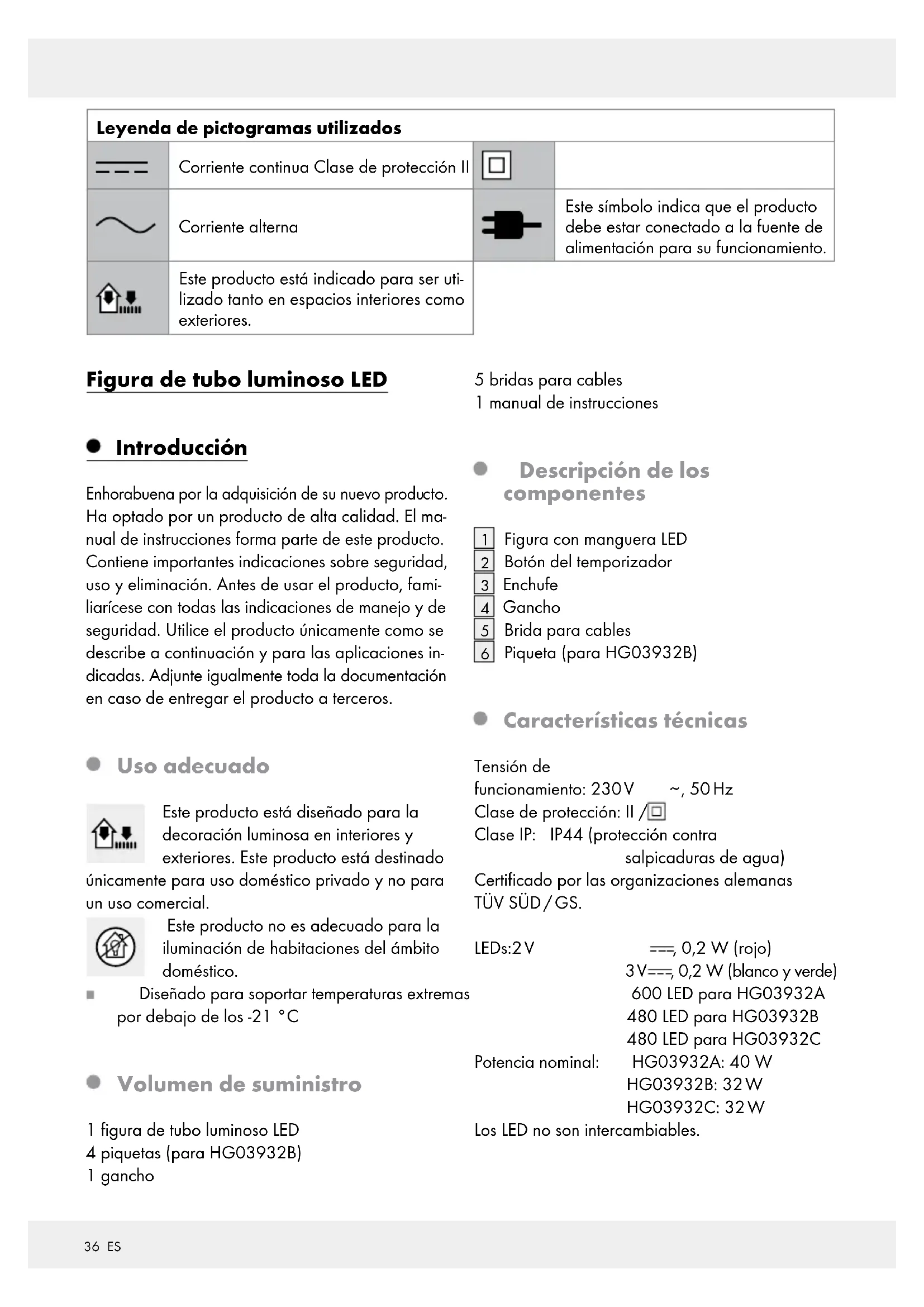 , 50 Hz Clase de protección: II / Clase IP: IP44 (protección contra salpicaduras de agua) Certificado por las organizaciones alemanas TÜV SÜD / GS. LEDs: 2 V , 0,2 W (rojo) 3 V , 0,2 W (blanco y verde) 600 LED para HG03932A 480 LED para HG03932B 480 LED para HG03932C Potencia nominal: HG03932A: 40 W HG03932B: 32 W HG03932C: 32 W Los LED no son intercambiables.37 ES Aviso sobre seguridad