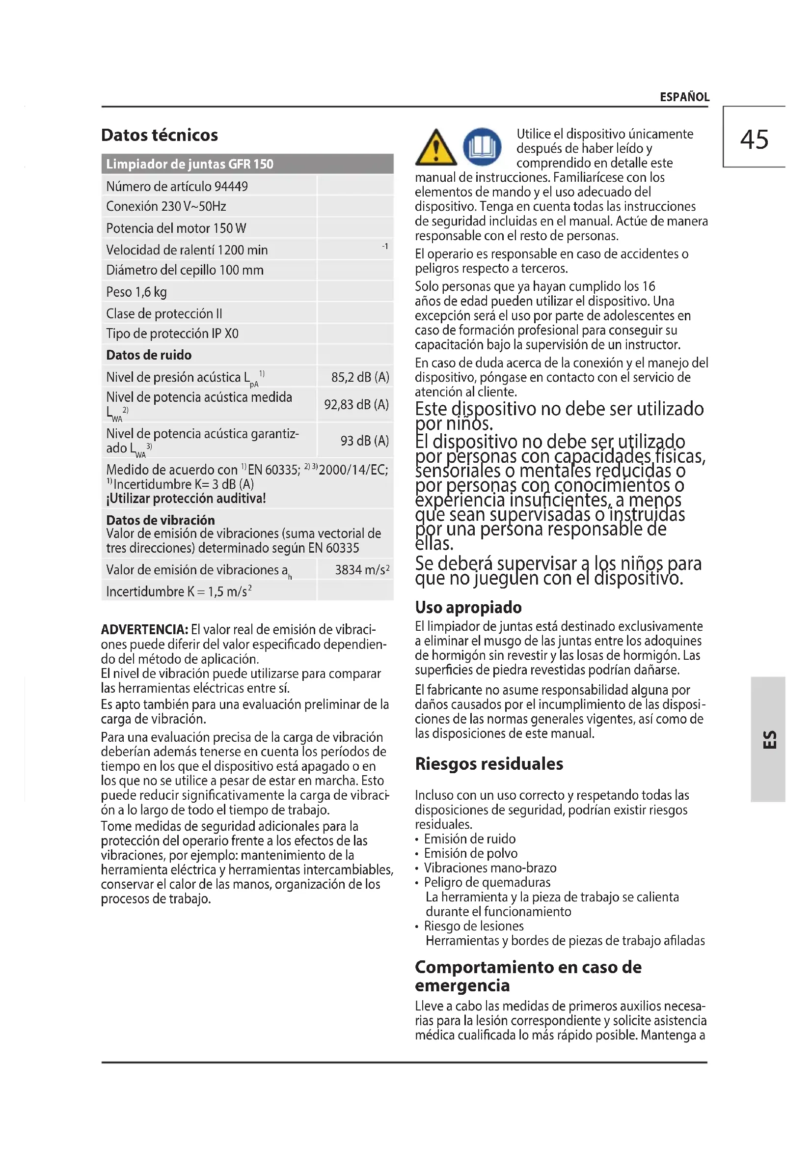 Datos técnicos Limpiador de juntas GFR 150 Número de artículo 94449 Conexión 230 V~50Hz Potencia del motor 150 W Velocidad de ralentí 1200 min