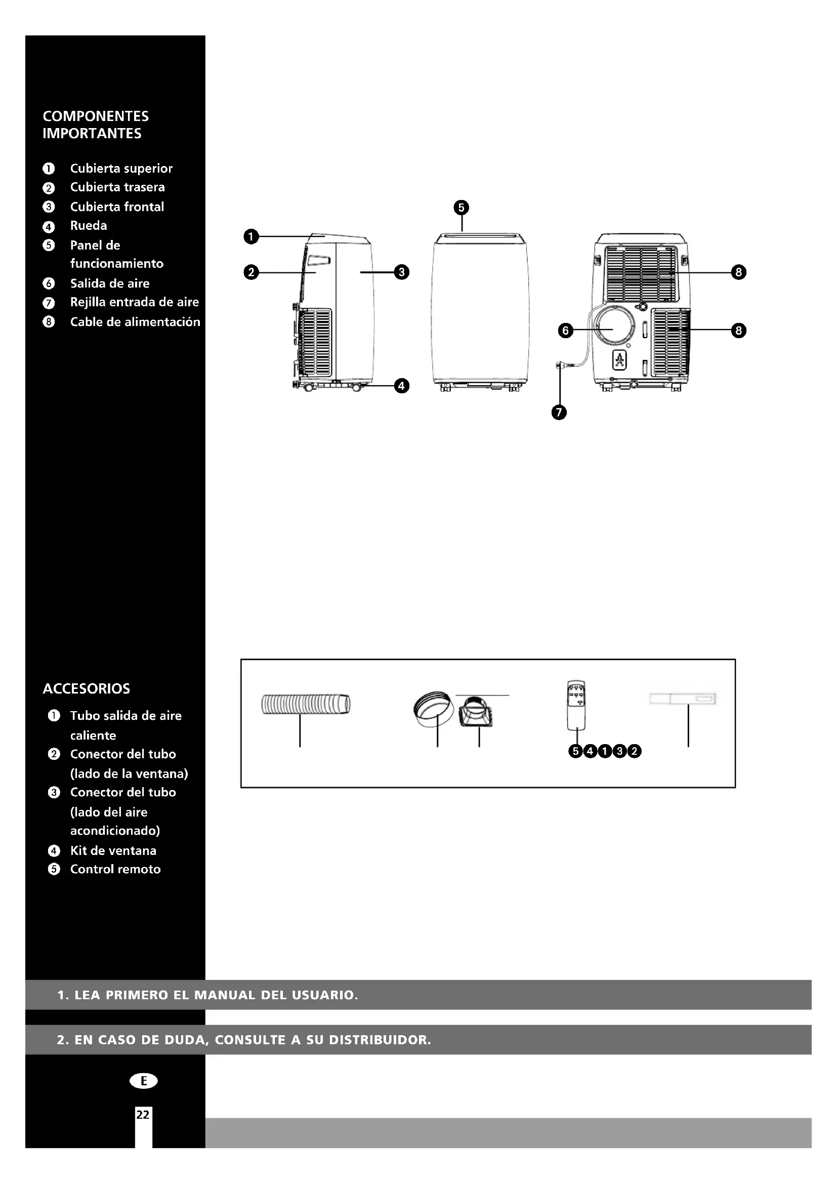 Tubo salida de aire caliente Conector del tubo (lado de la ventana) Conector del tubo (lado del aire acondicionado) Kit de ventana Control remoto