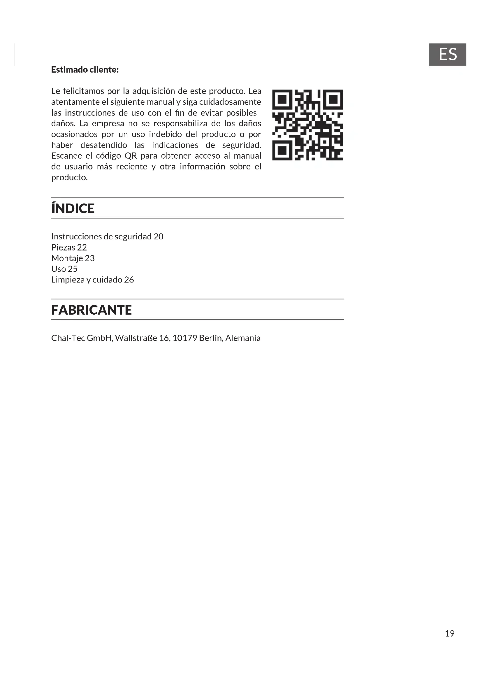 Estimado cliente: Le felicitamos por la adquisición de este producto. Lea atentamente el siguiente manual y siga cuidadosamente las instrucciones de uso con el n de evitar posibles daños. La empresa no se responsabiliza de los daños ocasionados por un uso indebido del producto o por haber desatendido las indicaciones de seguridad. Escanee el código QR para obtener acceso al manual de usuario más reciente y otra información sobre el producto. ÍNDICE Instrucciones de seguridad 20 Piezas 22 Montaje 23 Uso 25 Limpieza y cuidado 26 FABRICANTE Chal-Tec GmbH, Wallstraße 16, 10179 Berlin, Alemania20