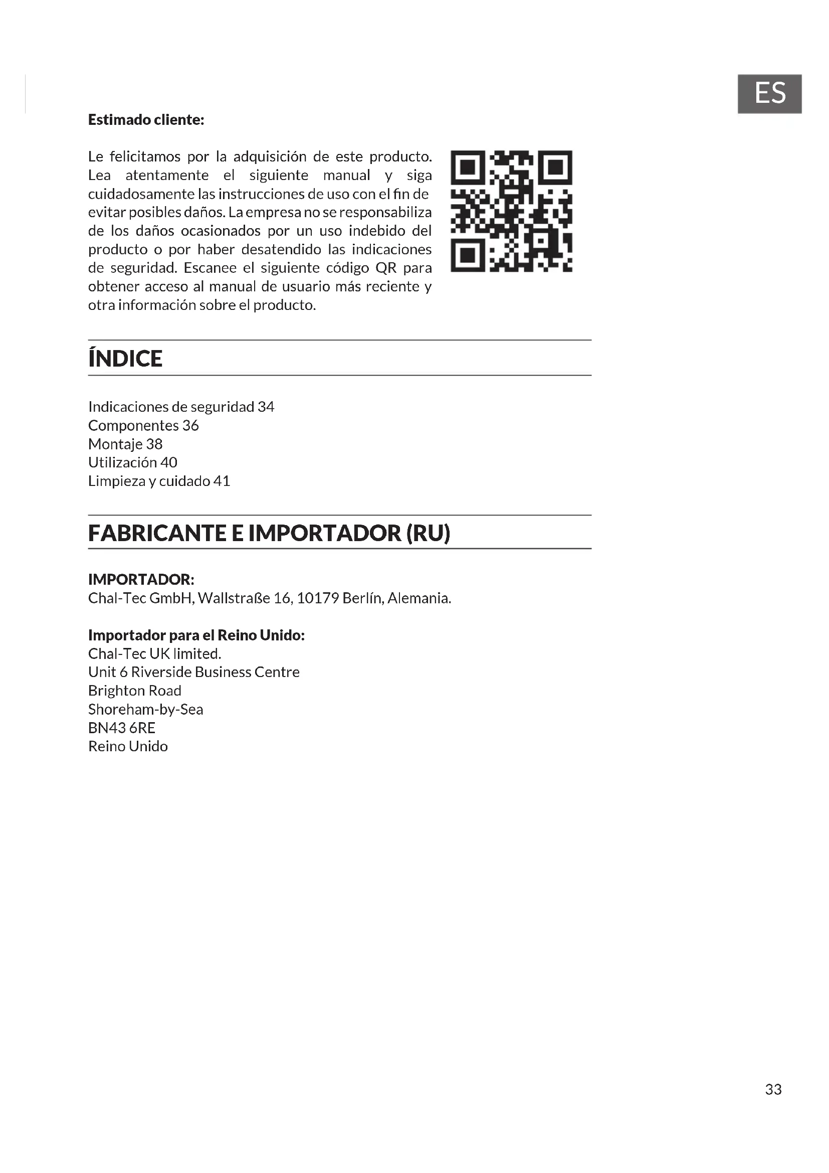 Le felicitamos por la adquisión de este producto. Lea atentamente el siguientesmanual y siga cuidadosamente las instrucciones de uso con el fin de evaporar posibles daños. LaEmpresa no se responsabiliza de los días occasionados por un uso indefinido del producto o por haber desatendido lasindicaciones de seguridad. Escanee elTAILGuedo QR para Obtener acces al manual de usuario másrecente y otra informacion sobre el producto.