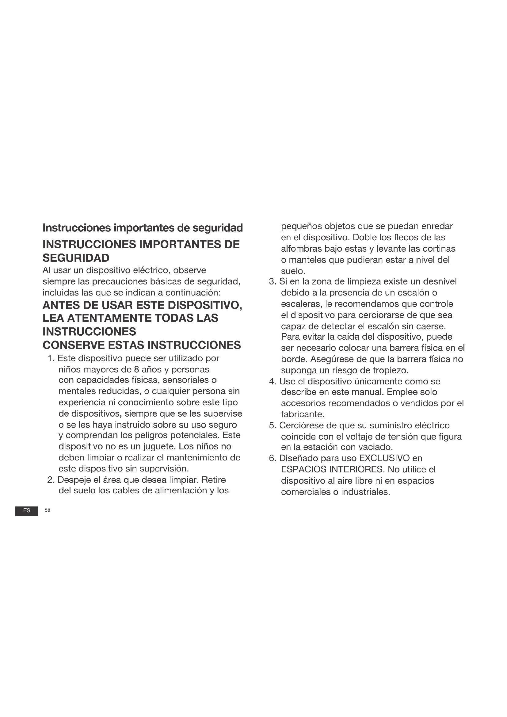 - No use el dispositivo si el cable de alimentación o el enchufe está danados. No use el dispositivo ni la estación con vaciado si no funciona correctamente, si han sufrido una caía, si está danados, si se han dejo olvidados en el exterior o si hanentrado en contacto con agua. En ese caso, el fabricante o un先进技术 de servicios deferán repararlos paraatarposibles riesgos.
