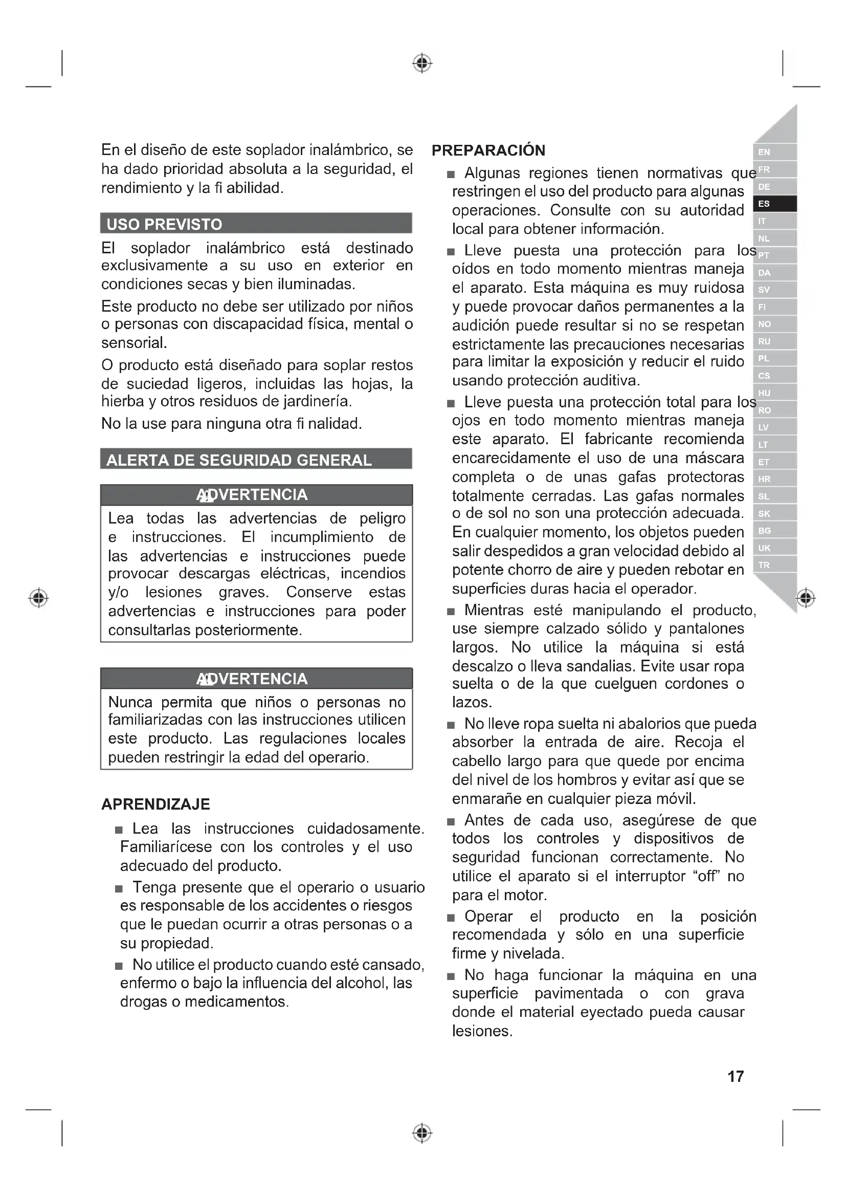 En el diseño de este soplador inalámbrico, se ha dado prioridad absoluta a la seguridad, el rendimiento y la fi abilidad. USO PREVISTO El soplador inalámbrico está destinado exclusivamente a su uso en exterior en condiciones secas y bien iluminadas. Este producto no debe ser utilizado por niños o personas con discapacidad física, mental o sensorial. O producto está diseñado para soplar restos de suciedad ligeros, incluidas las hojas, la hierba y otros residuos de jardinería. No la use para ninguna otra fi nalidad.