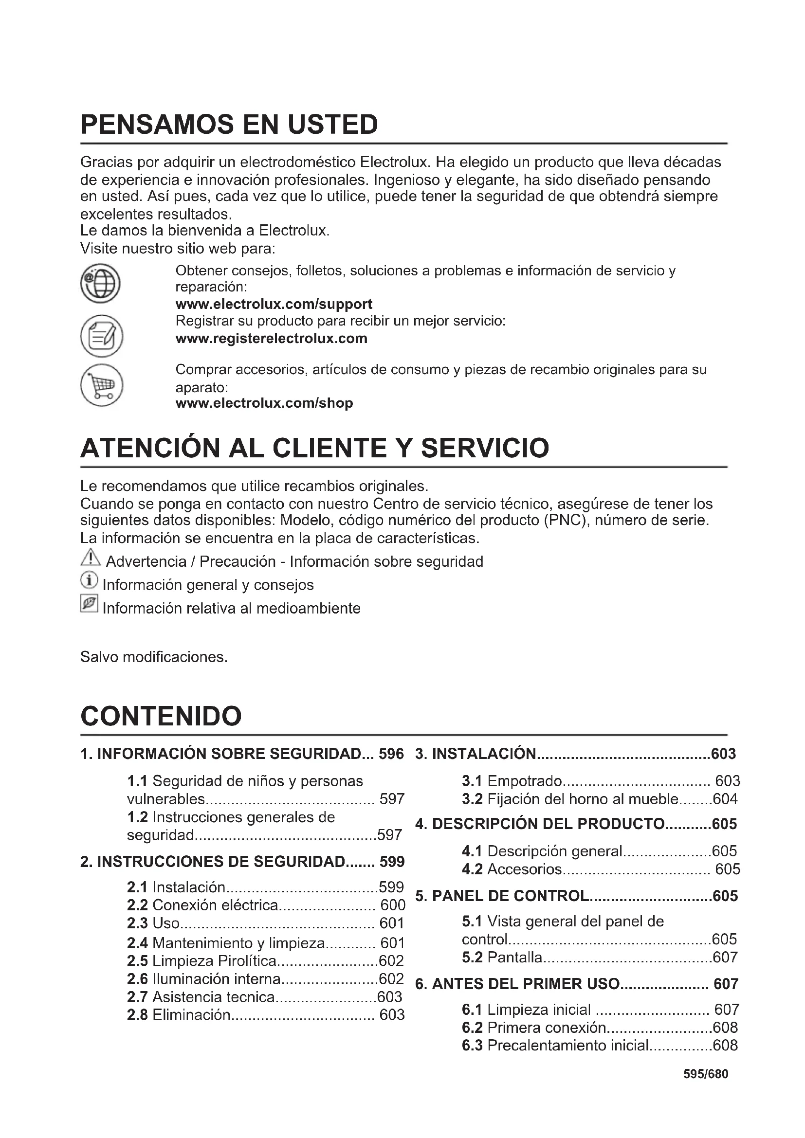 Le recomendamos que utilice recambios originales. Cuando se ponga en contacto con nuestro Centro de servicio técnico, asegúrese de tener los siguientes datos disponibles: Modelo, código numérico del producto (PNC), número de serie. La información se encuentra en la placa de características. Advertencia / Precaución - Información sobre seguridad Información general y consejos Información relativa al medioambiente Salvo modificaciones. CONTENIDO