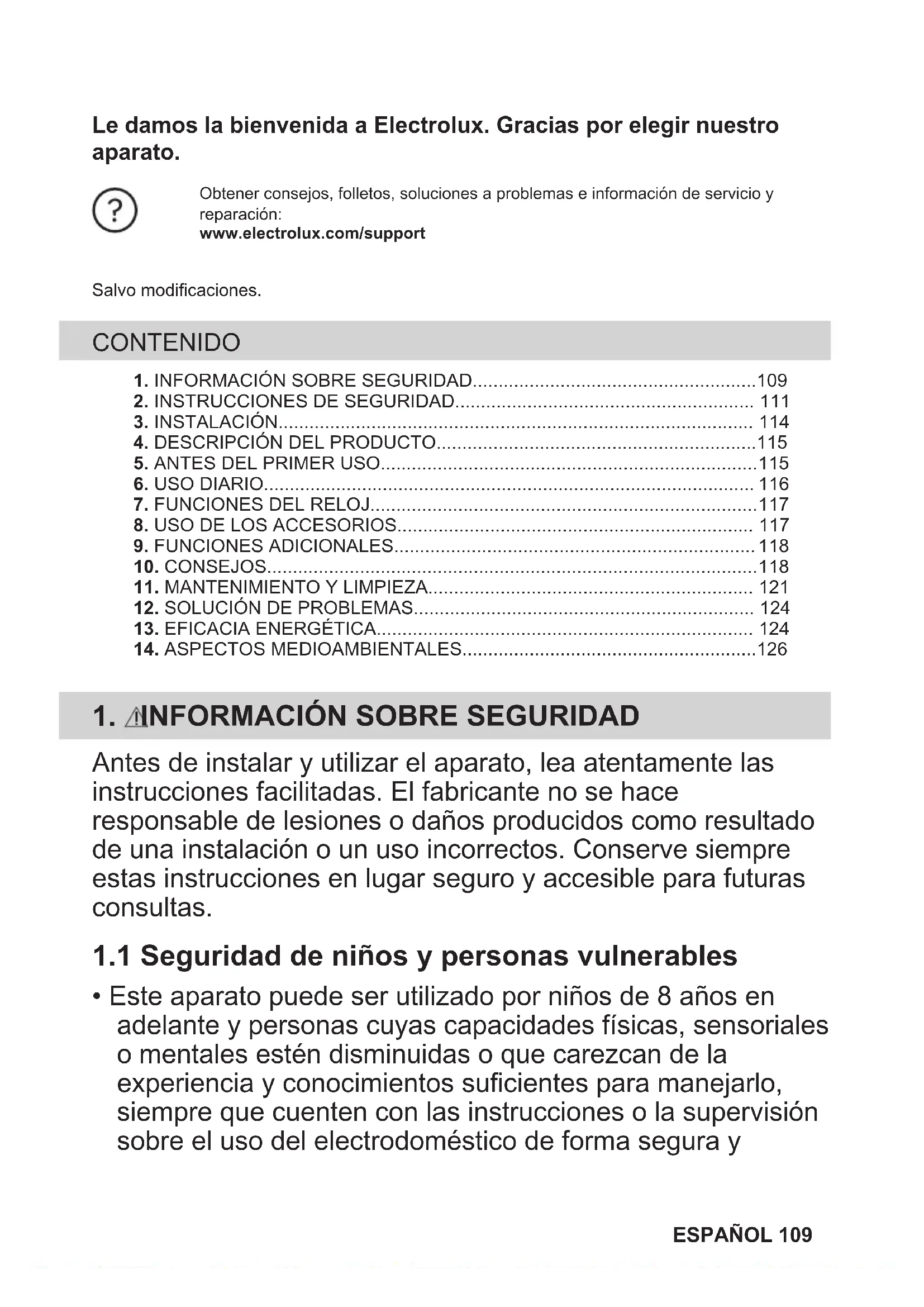 - Este aparato puede ser utilizado por niños de 8 años en adelante y personas cuyas capacidades físicas, sensoriales o mentales estén disminuidas o que carezcan de la experiencia y conocimientos suficientes para manejarlo, siempre que cuenten con las instrucciones o la supervisión sobre el uso del electrodoméstico de forma segura y ESPAÑOL 109comprendan los riesgos. Es necesario mantener alejados del aparato a los niños de menos de 8 años, así como a las personas con minusvalías importantes y complejas, salvo que estén bajo supervisión continua.
