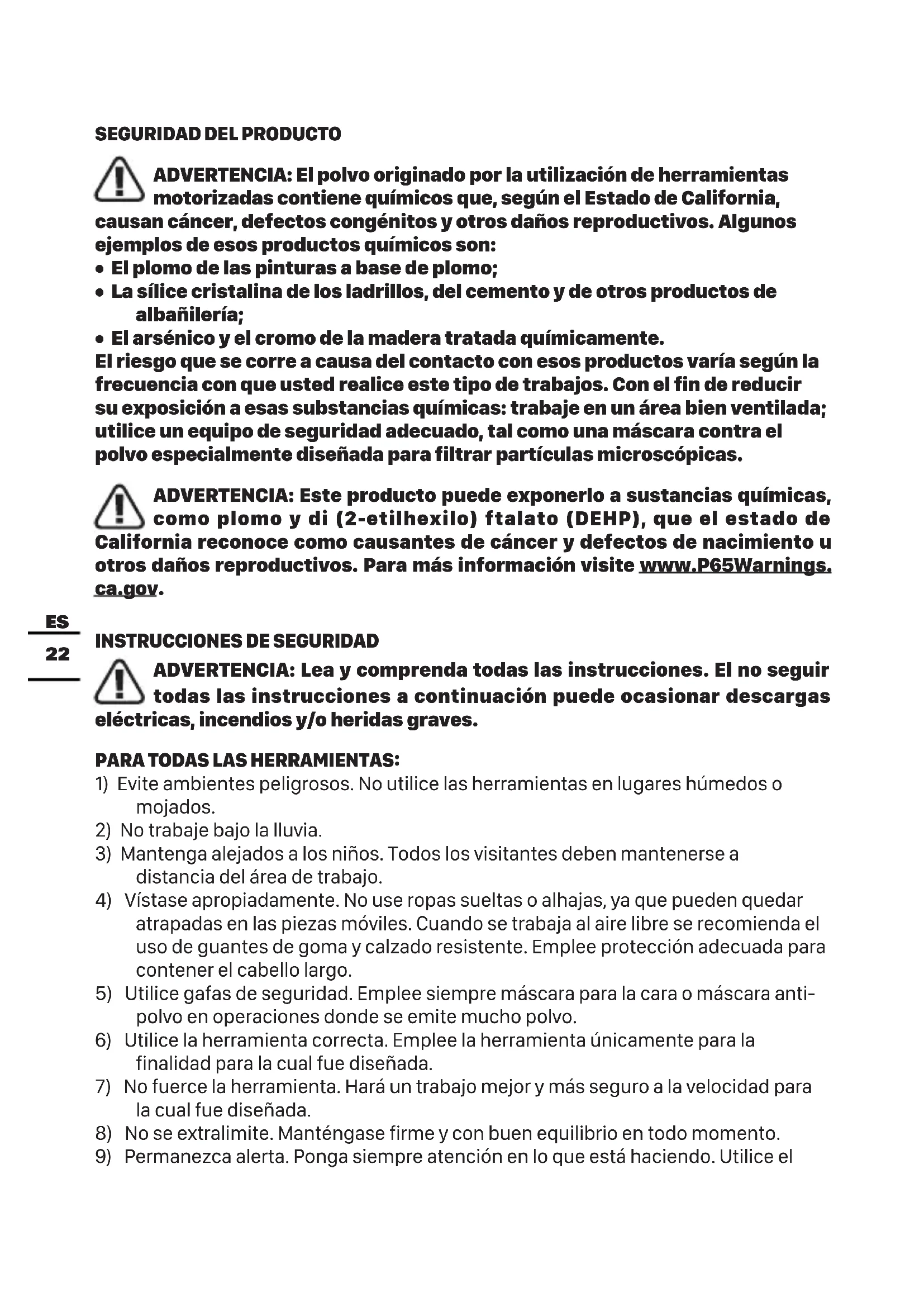 ADVERTENCIA: El polvo originado por la utilización de herramientas motorizadas contiene químicos que, según el Estado de California, causan cáncer, defectos congénitos y otros daños reproductivos. Algunos ejemplos de esos productos químicos son:
