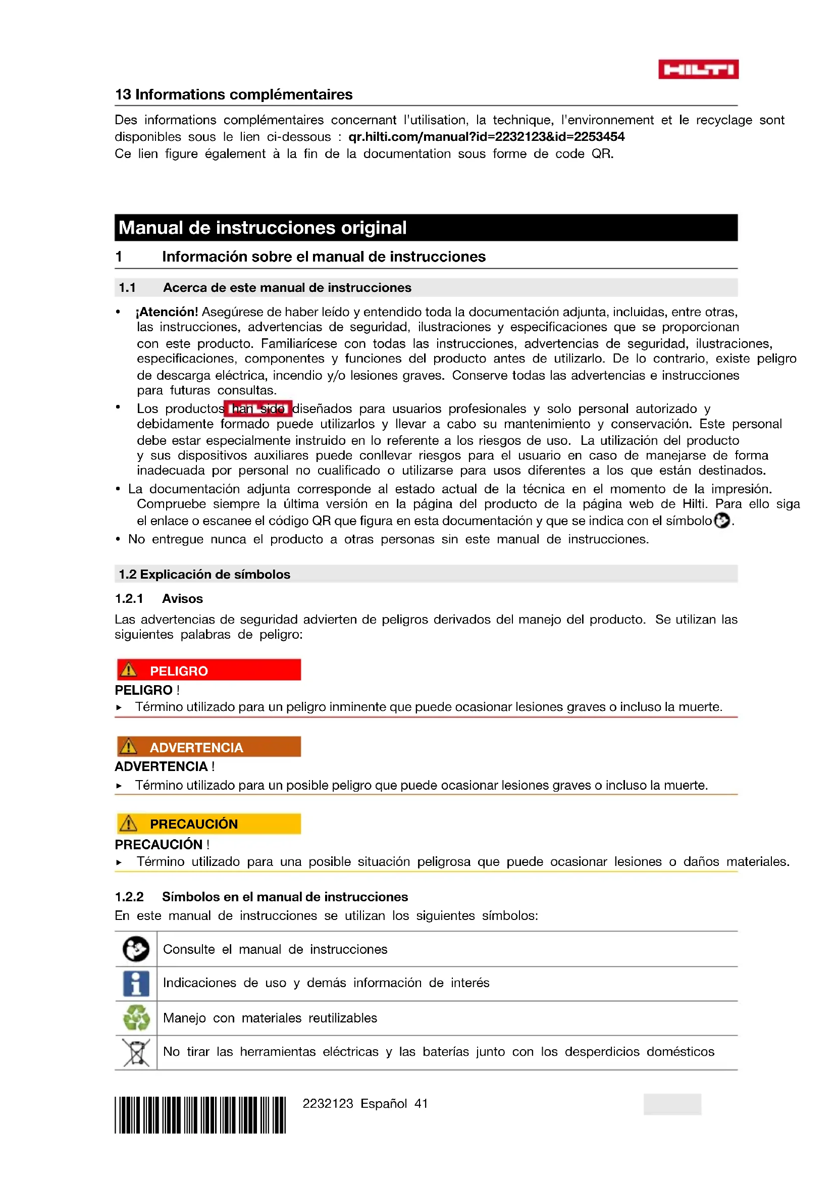Encontrará información adicional sobre manejo,技术水平, medio ambiente y reciclaje en elsignificante enlace: qr.hilti.com/manual?id=2232123&id=2253454