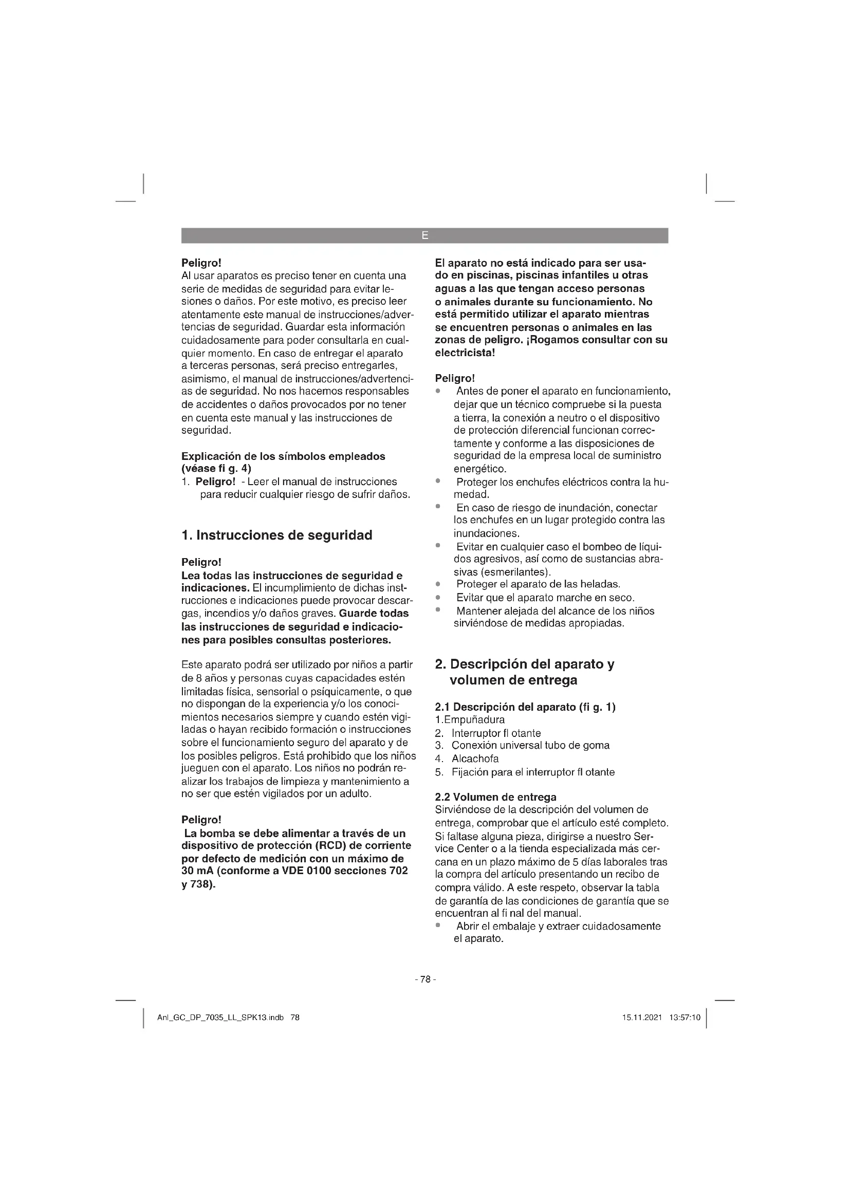 de forma estacionaria con manguera flexible Advertencia! ¡Antes de poner en funcionamiento la bomba, comprobar si hay condiciones especiales a con- templar para su instalación! Si, p. ej. un corte de corriente, la suciedad o una junta defectuosa pueden provocar daños mate- riales, es preciso tomar medidas de protección adicionales para la instalación. Anl_GC_DP_7035_LL_SPK13.indb 79Anl_GC_DP_7035_LL_SPK13.indb 79 15.11.2021 13:57:1015.11.2021 13:57:10E