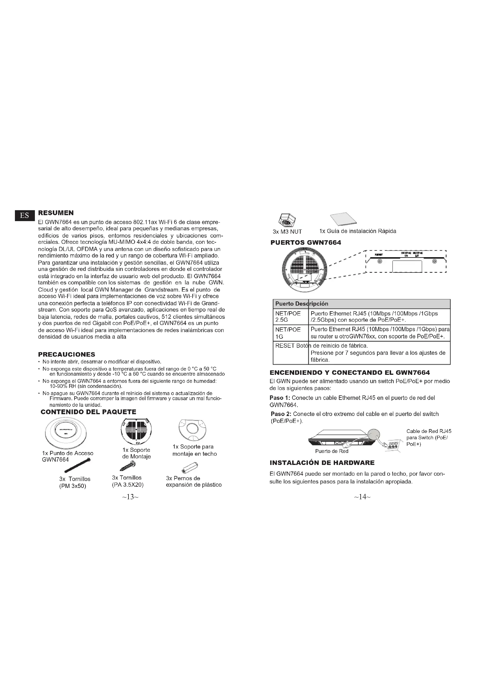 - 请在https://www.gwn.cloud.进行GWN7664的云端管理 。 欲获取详细的话机使用信息,请在以下链接中下载GWN7664用户手册。 http://www.grandstream.com/support GNU GPL许可条款已包含在设备固件中,可以通过设 备的Web用户界 面 my_device_ip/gpl_license 进行访问。 也可以通过以下链接访问:http:// www.grandstream.com/legal/open-source-software 如果需要包含GPL源代码 信息的CD,请发邮件到 info@grandstream.com 提交请求 。 This device complies with part 15 of the FCC rules. Operation is subject to the following two conditions: (1) this device may not cause harmful interference, and (2) this device must accept any interference received, including interference that may cause undesired operation. CAN ICES-3(B)/NMB-3(B)IC: 11964A-GWN7664FCC ID: YZZGWN7664 Model: GWN7664 Input: 48V 0.5A PoE~13~ ~14~ RESUMEN El GWN7664 es un punto de acceso 802.11ax Wi-Fi 6 de clase empre- sarial de alto desempeño, ideal para pequeñas y medianas empresas, edicios de varios pisos, entornos residenciales y ubicaciones com- erciales. Ofrece tecnología MU-MIMO 4x4:4 de doble banda, con tec- nología DL/UL OFDMA y una antena con un diseño sosticado para un rendimiento máximo de la red y un rango de cobertura Wi-Fi ampliado. Para garantizar una instalación y gestión sencillas, el GWN7664 utiliza una gestión de red distribuida sin controladores en donde el controlador está integrado en la interfaz de usuario web del producto. El GWN7664 también es compatible con los sistemas de gestión en la nube GWN. Cloud y gestión local GWN Manager de Grandstream. Es el punto de acceso Wi-Fi ideal para implementaciones de voz sobre Wi-Fi y ofrece una conexión perfecta a teléfonos IP con conectividad Wi-Fi de Grand- stream. Con soporte para QoS avanzado, aplicaciones en tiempo real de baja latencia, redes de malla, portales cautivos, 512 clientes simultáneos y dos puertos de red Gigabit con PoE/PoE+, el GWN7664 es un punto de acceso Wi-Fi ideal para implementaciones de redes inalámbricas con densidad de usuarios media a alta