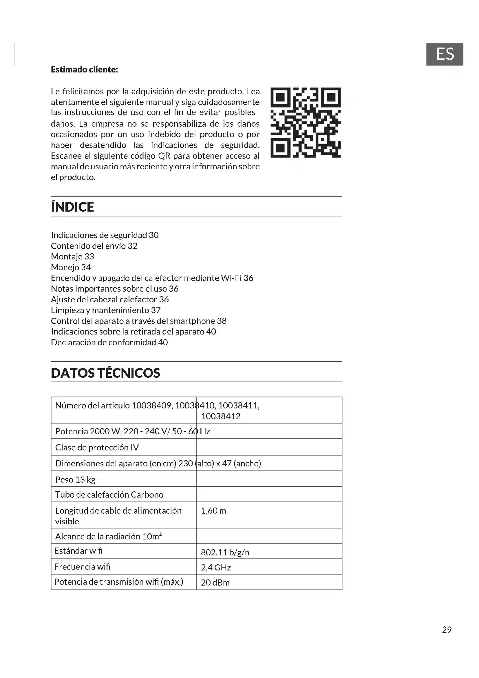 Estimado cliente: Le felicitamos por la adquisición de este producto. Lea atentamente el siguiente manual y siga cuidadosamente las instrucciones de uso con el n de evitar posibles daños. La empresa no se responsabiliza de los daños ocasionados por un uso indebido del producto o por haber desatendido las indicaciones de seguridad. Escanee el siguiente código QR para obtener acceso al manual de usuario más reciente y otra información sobre el producto. ÍNDICE Indicaciones de seguridad 30 Contenido del envío 32 Montaje 33 Manejo 34 Encendido y apagado del calefactor mediante Wi-Fi 36 Notas importantes sobre el uso 36 Ajuste del cabezal calefactor 36 Limpieza y mantenimiento 37 Control del aparato a través del smartphone 38 Indicaciones sobre la retirada del aparato 40 Declaración de conformidad 40