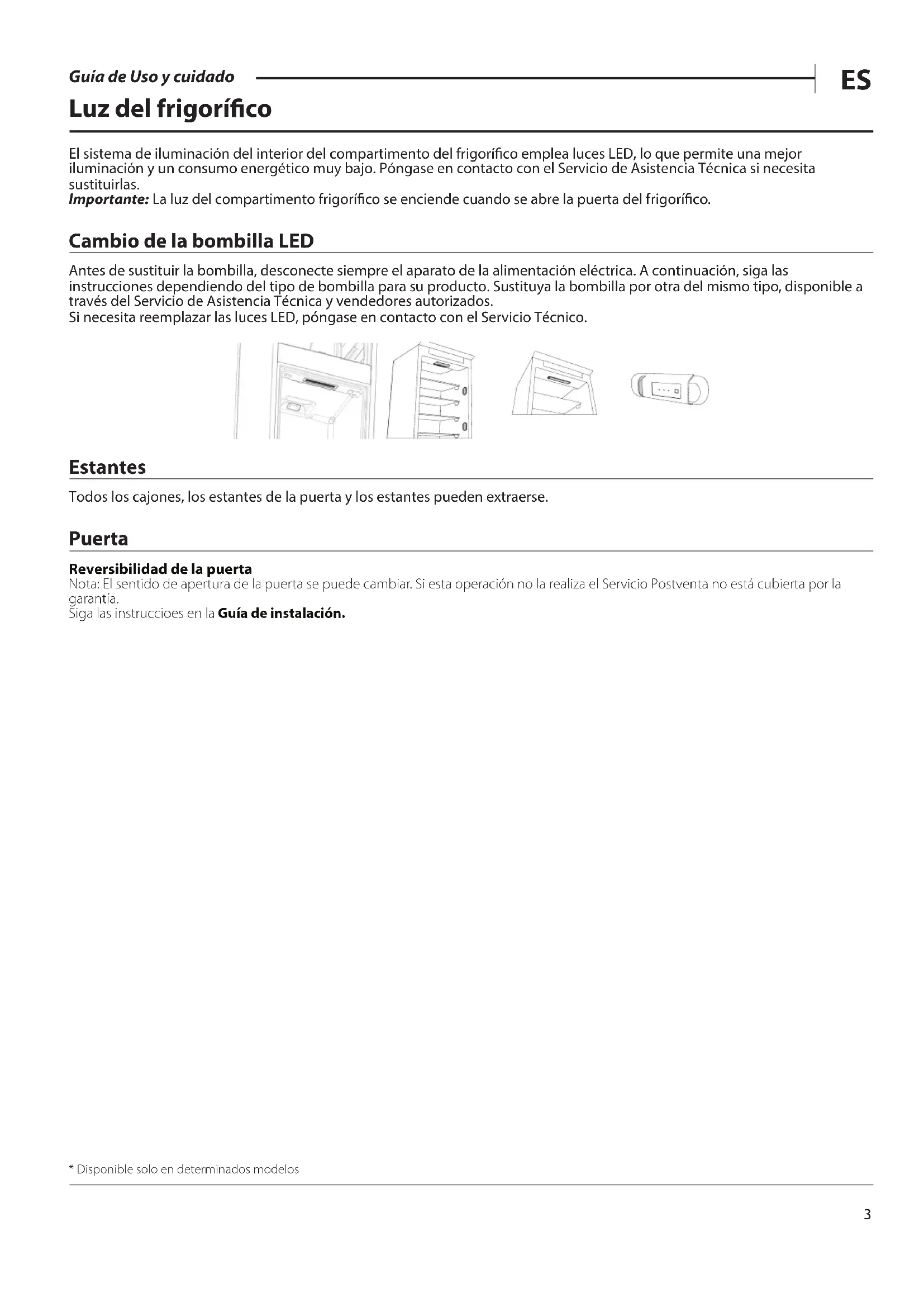 Guía de Uso y cuidado Luz del frigorífico El sistema de iluminación del interior del compartimento del frigoríco emplea luces LED, lo que permite una mejor iluminación y un consumo energético muy bajo. Póngase en contacto con el Servicio de Asistencia Técnica si necesita sustituirlas. Importante: La luz del compartimento frigoríco se enciende cuando se abre la puerta del frigoríco. Cambio de la bombilla LED Antes de sustituir la bombilla, desconecte siempre el aparato de la alimentación eléctrica. A continuación, siga las instrucciones dependiendo del tipo de bombilla para su producto. Sustituya la bombilla por otra del mismo tipo, disponible a través del Servicio de Asistencia Técnica y vendedores autorizados. Si necesita reemplazar las luces LED, póngase en contacto con el Servicio Técnico. Estantes Todos los cajones, los estantes de la puerta y los estantes pueden extraerse. Puerta Reversibilidad de la puerta Nota: El sentido de apertura de la puerta se puede cambiar. Si esta operación no la realiza el Servicio Postventa no está cubierta por la garantía.Siga las instruccioes en la Guía de instalación.* Disponible solo en determinados modelos4 Guía de Uso y cuidado Cómo usar el aparato Primer uso Espere como mínimo dos horas tras la instalación para conectar el aparato al suministro eléctrico. El aparato se pondrá en marcha automáticamente al conectarlo al suministro eléctrico. Las temperaturas ideales para almacenar alimentos se pre- establecen en fábrica. Después de activar el aparato, es necesario esperar 4-6 horas para que pueda alcanzarse la temperatura de conservación correcta para un aparato con carga normal. Coloque el ltro antiolor y antibacterias en el ventilador como se indica en el envase del ltro (si está disponible). Si suena una señal acústica, signica que se ha activado la alarma de temperatura: pulse el botón para apagar la alarma acústica. Compartimento del frigorífico y conservación de alimentos El compartimento frigoríco permite conservar alimentos frescos y bebidas. La descongelación del compartimento frigoríco es totalmente automática. La presencia ocasional de gotas de agua en la pared posterior interna del compartimento indica que se está produciendo la fase de descongelación automática. El agua de descongelación pasa a un oricio de desagüe y después a un recipiente, donde se evapora. Nota: la temperatura ambiente, la frecuencia con la que se abran las puertas y la ubicación del aparato pueden afectar a las temperaturas internas de los dos compartimentos. Programe las temperaturas en función de estos factores. En condiciones muy húmedas se puede formar condensación en el compartimento frigorífico, especialmente en los estantes de cristal. En este caso, se recomienda cerrar los recipientes que contengan líquidos (p. ej. ollas con caldo), envolver los alimentos con alto contenido en humedad (p. ej. verduras) y conectar el ventilador, si está disponible. Todos los cajones, los estantes de la puerta y los estantes pueden extraerse. Distribución de aire de flujo múltiple El ujo múltiple ayuda a distribuir uniformemente el aire frío en la cavidad para una mejor conservación de los alimentos. Los alimentos se pueden colocar en cualquier estante del aparato. Procure no obstruir los conductos de distribución de aire para garantizar su libre circulación. Cómo almacenar alimentos frescos y bebidas Los alimentos que desprenden mucho gas etileno (manzanas, albaricoques, peras, melocotones, aguacates, higos, ciruelas, arándanos, melones o judías) y aquellos que son sensibles a este gas, como las frutas y verduras o la lechuga, deben conservarse siempre en compartimentos separados o envolverse para no reducir su tiempo de conservación; Por ejemplo, no debe conservar los tomates junto con los kiwis o la col. No coloque los alimentos muy juntos para permitir una adecuada circulación de aire. Utilice recipientes reciclables de plástico, metal, aluminio y cristal o lm transparente para envolver los alimentos. Si tiene que almacenar poca cantidad de alimentos en el frigoríco, recomendamos utilizar los estantes de encima del cajón para frutas y verduras ya que es la parte del compartimento mejor refrigerada. Utilice siempre contenedores con tapa para líquidos y alimentos que puedan desprender o tomar olor o sabor de otros alimentos o cúbralos. Para evitar que se vuelquen las botellas, puede utilizar soporte para botellas (disponibles en algunos modelos).